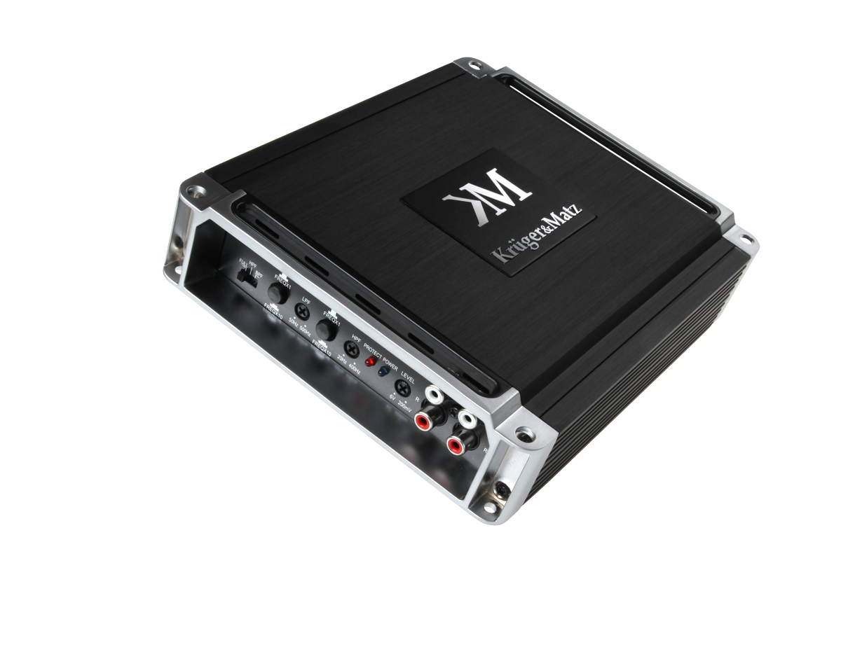 Wzmacniacze Kruger&Matz to połączenie odpowiednich parametrów mocy, stabilnego działania i czystego brzmienia. Kanały szerokopasmowe we wzmacniaczach zapewniają czysty dźwięk o niskich zniekształceniach oraz generują potężną dawkę mocy, zgodną ze standardem klasy D. W stopniach mocy zastosowano przełączane tranzystory o dużej obciążalności pozwalające uzyskać dynamikę i sprawność na poziomie 85-90% przy małych zniekształceniach. Wysoka sprawność umożliwia stosowanie mniejszych zasilaczy, radiatorów i obudów.