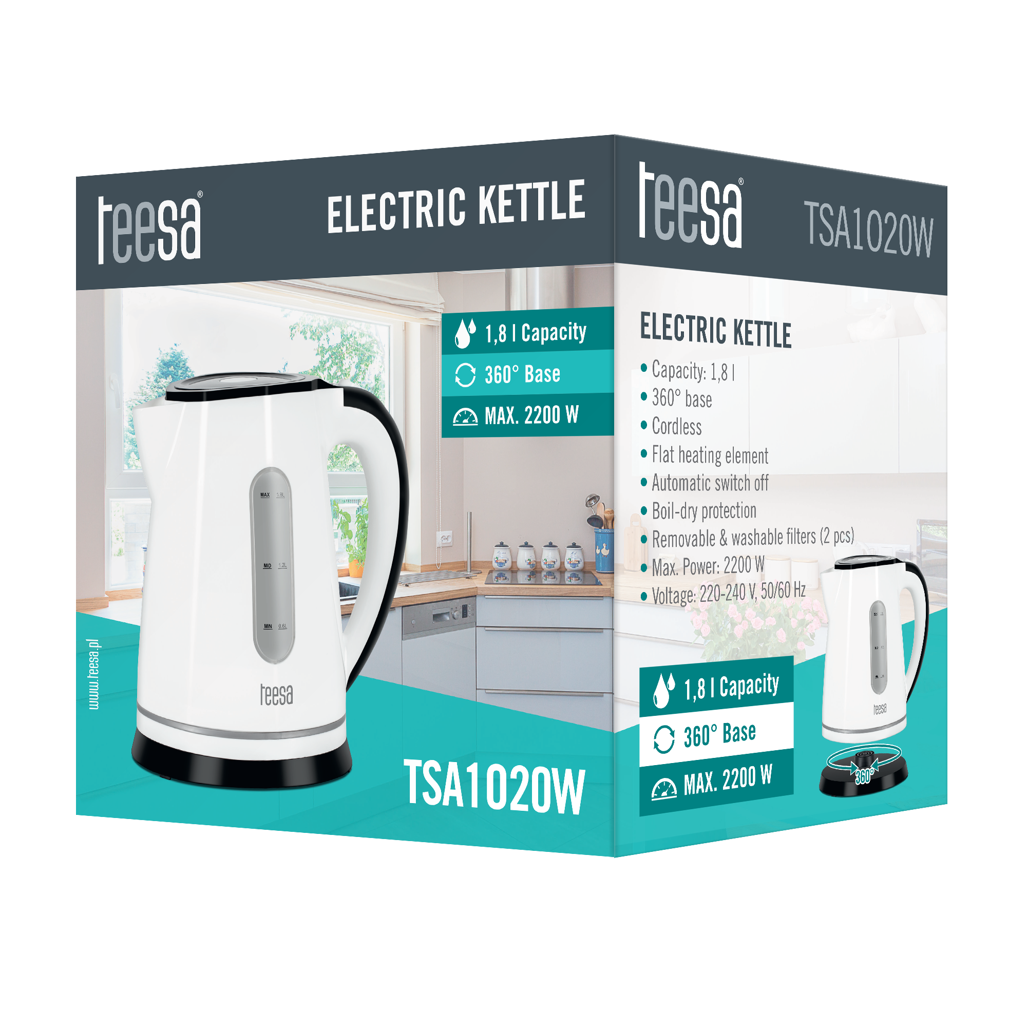 <p>Wysokogatunkowe tworzywo, z którego został wykonany czajnik Teesa o symbolu TSA1020 oraz dostępność w kolorze <b>białym lub czarnym</b>, sprawia, że urządzenie idealnie wkomponuje się w niemal każdy wystrój kuchni.<b> Duża pojemność – 1,8 l</b> oraz moc maksymalna 2200W umożliwiają szybkie zagotowanie dużej ilości wody, a bardzo <b>cichy element grzejny</b> zapewnia prawie niesłyszalną pracę. </p>