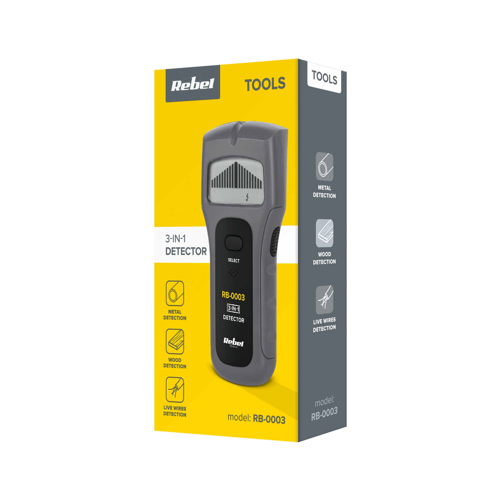 <h2>Detektor metali, napięcia i drewna REBEL RB-0003</h2><p>Detektor REBEL RB-0003 to niezastąpione narzędzie dla majsterkowiczów oraz profesjonalistów, umożliwiające szybkie i precyzyjne wykrywanie metalowych, drewnianych oraz elektrycznych elementów w ścianach. Dzięki wszechstronności i intuicyjnej obsłudze, ułatwia wykonywanie prac montażowych, remontowych i instalacyjnych.</p>