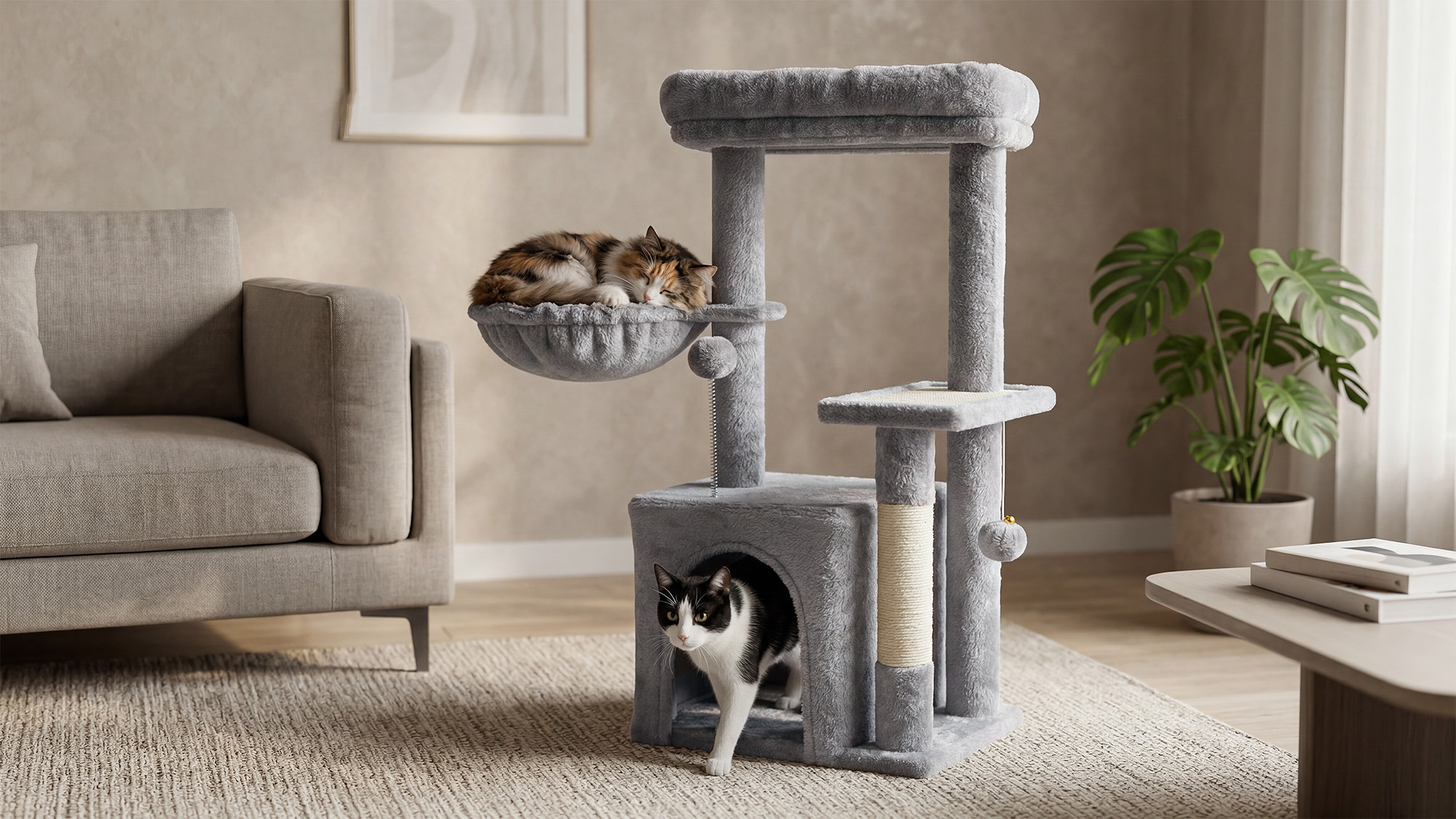 <h2>Przestronny domek i wygodny hamak</h2><p>Drapak oferuje dwa wyjątkowe miejsca do odpoczynku – zamknięty, przytulny domek oraz miękki hamak dopasowujący się do ciała kota. To doskonałe strefy relaksu po zabawie, zapewniające komfort i poczucie bezpieczeństwa. Różnorodność miejsc pozwala pupilowi wybrać ulubioną formę wypoczynku.</p>