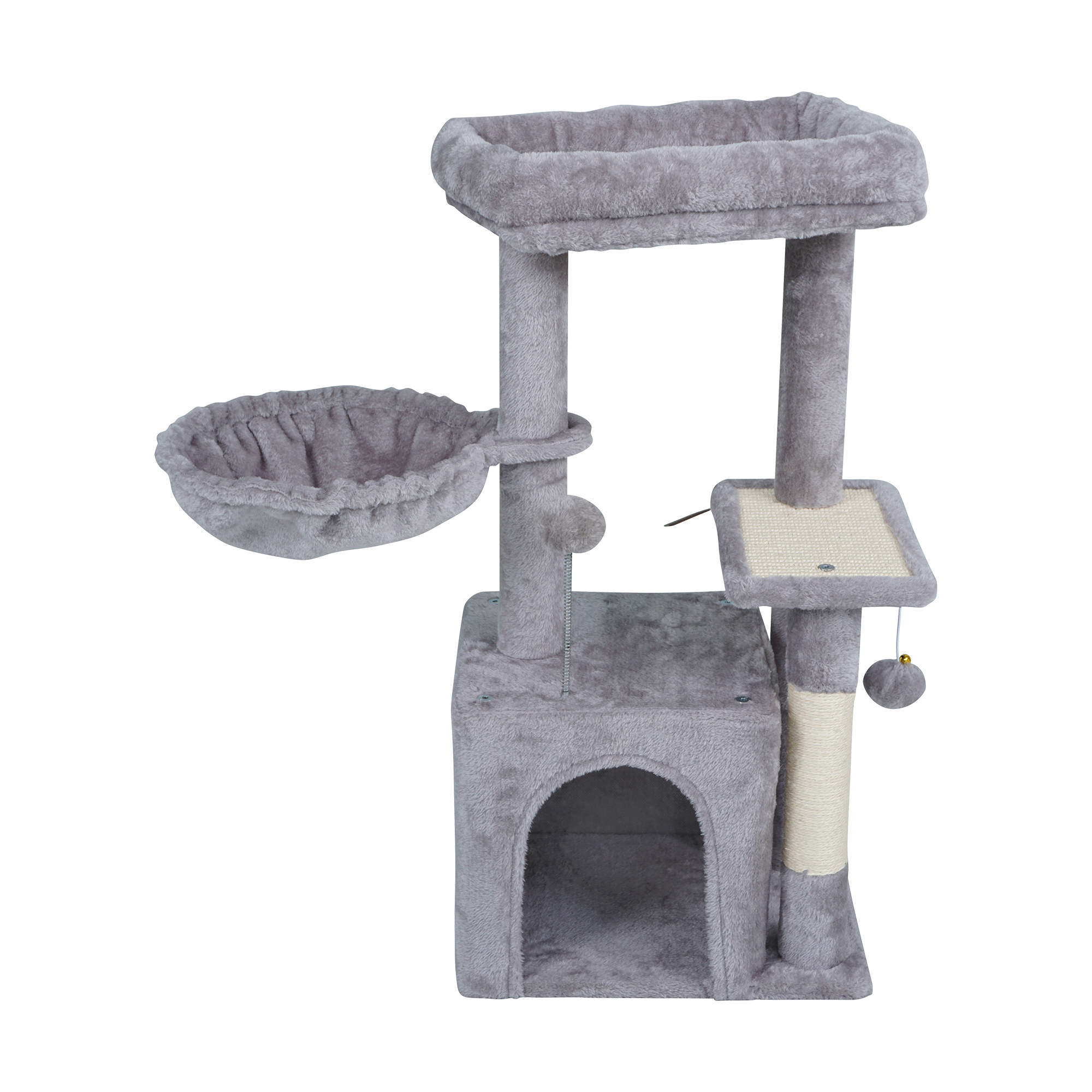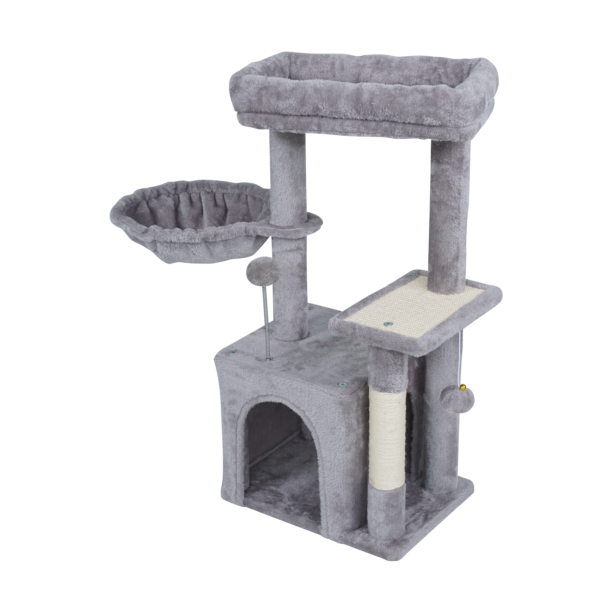 <h2>Trzy sizalowe słupki do drapania</h2><p>Wytrzymałe słupki owinięte naturalnym sizalem umożliwiają kotu swobodne ostrzenie pazurów i realizację naturalnych instynktów. Dzięki kilku poziomom drapania drapak jest bardziej funkcjonalny i zachęca do aktywności. To skuteczny sposób na ochronę mebli oraz zapewnienie kotu codziennej dawki ruchu.</p>