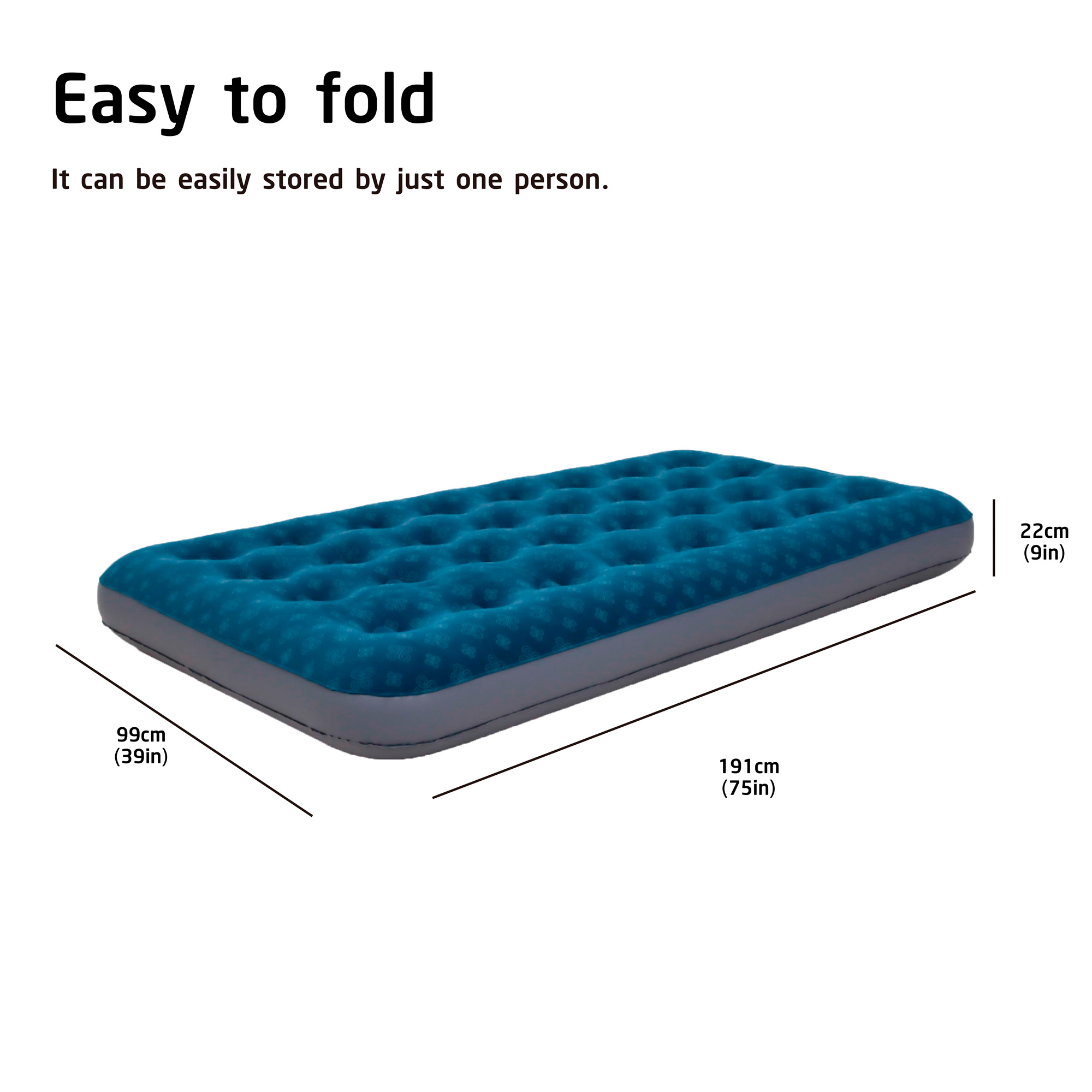 Więcej przestrzeni dla komfortuSzerokość aż 99 cm daje więcej miejsca niż standardowe materace jednoosobowe. Wysokość 22 cm gwarantuje lepszą izolację od podłoża i stabilną powierzchnię do spania, a miękka welurowa powłoka podnosi komfort snu.
