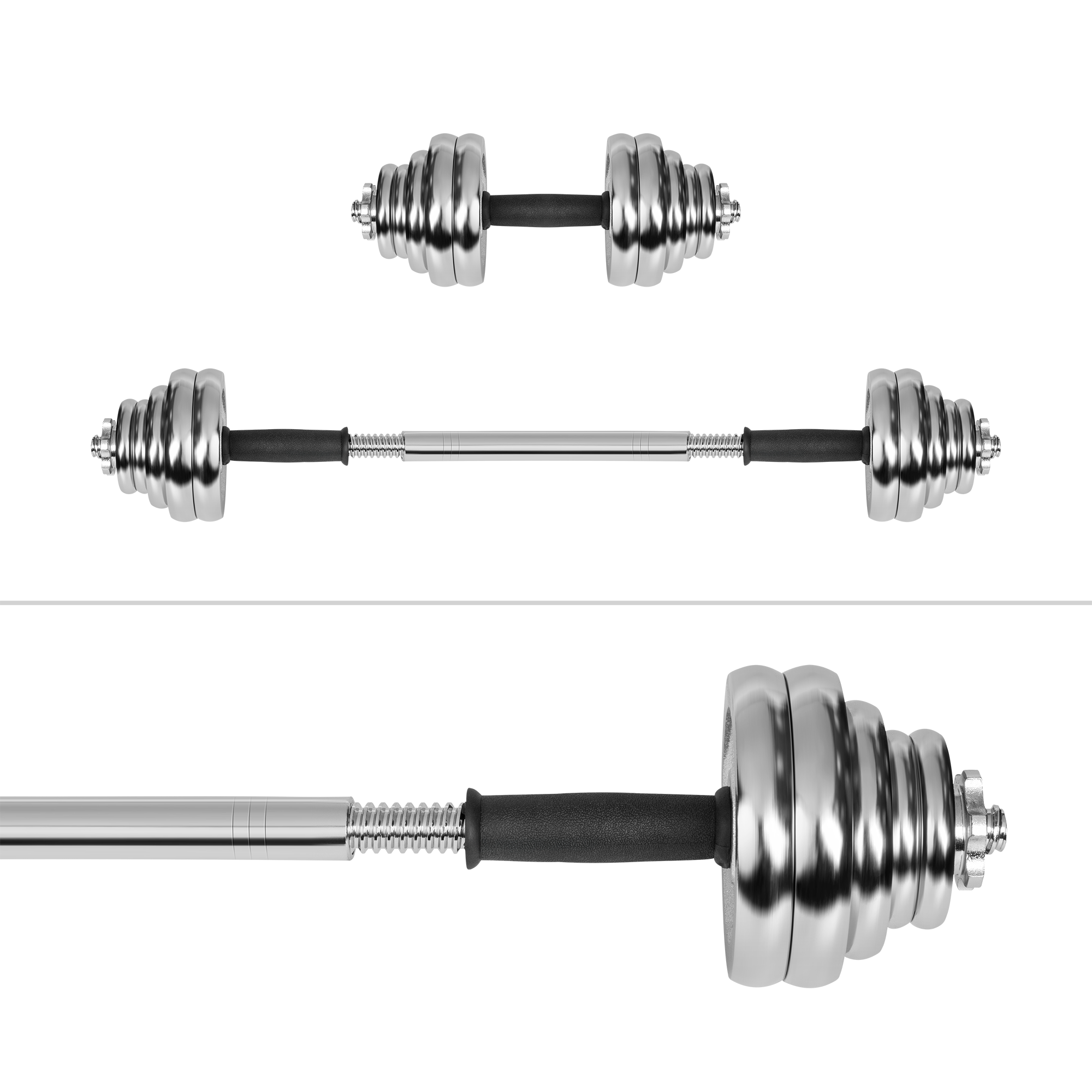 <h2>Jakość, którą widać</h2><p>Zestaw wykonany z wysokiej jakości żeliwa, pokrytego trwałą powłoką chromowaną, która zabezpiecza przed korozją, zarysowaniami i uszkodzeniami mechanicznymi. Chrom nadaje hantlom elegancki wygląd i zwiększa ich żywotność, nawet przy intensywnym użytkowaniu. </p>