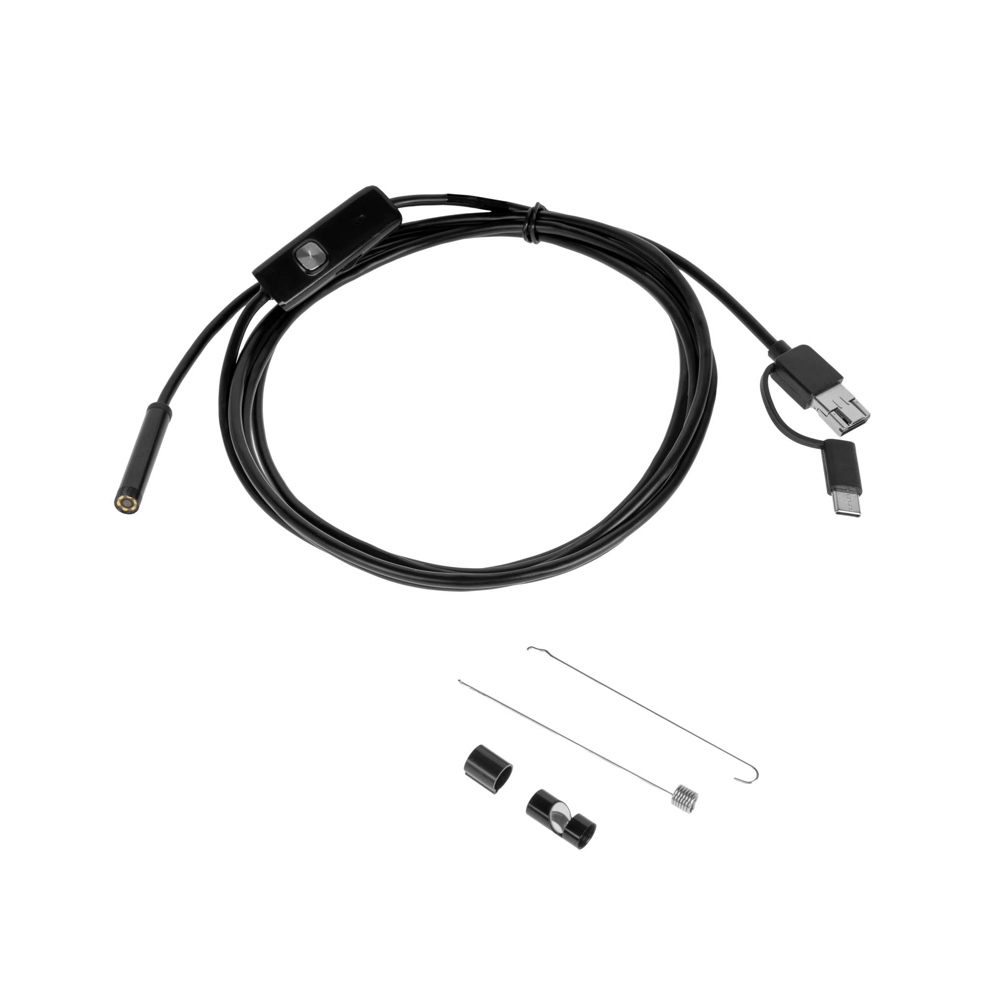 W zestawie: kamera, końcówki (haczyk, magnes, lusterko boczne), instrukcja obsługi