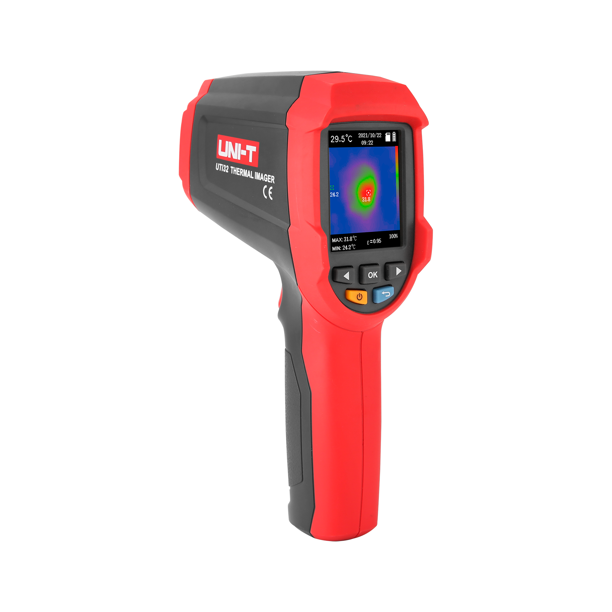 <h2>Funkcjonalny wyświetlacz i intuicyjna obsługa</h2><p>Kamera jest wyposażona w 2,4-calowy wyświetlacz TFT LCD o rozdzielczości 480 x 320 pikseli, który zapewnia wyraźny podgląd obrazu termicznego. UTi32 oferuje trzy palety kolorów (tęcza, czerwony, szary), co umożliwia dostosowanie obrazu do indywidualnych potrzeb użytkownika. Pole widzenia 30° x 30° oraz częstotliwość odświeżania <9 Hz zapewniają płynność i szerokie pokrycie obszaru pomiaru.</p>