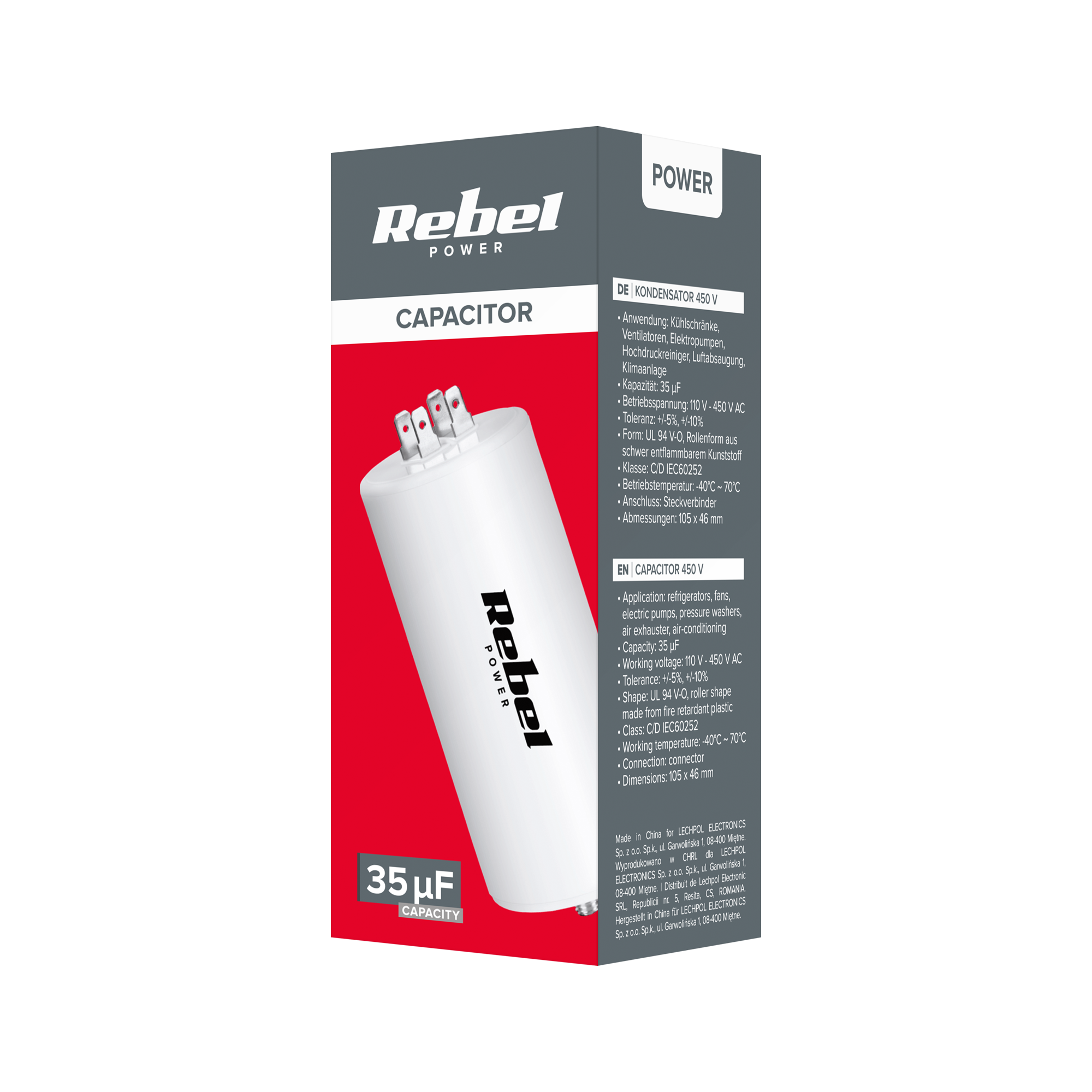 Kondensator 35uF jest przystosowany do pracy w szerokim zakresie temperatur od -40°C do 70°C, co umożliwia jego stosowanie w różnorodnych środowiskach, zarówno wewnętrznych, jak i zewnętrznych. Kompaktowe wymiary (105 x 46 mm) oraz łatwy montaż za pomocą konektora sprawiają, że kondensator jest prosty w instalacji i może być szybko zintegrowany z różnymi systemami elektrycznymi.