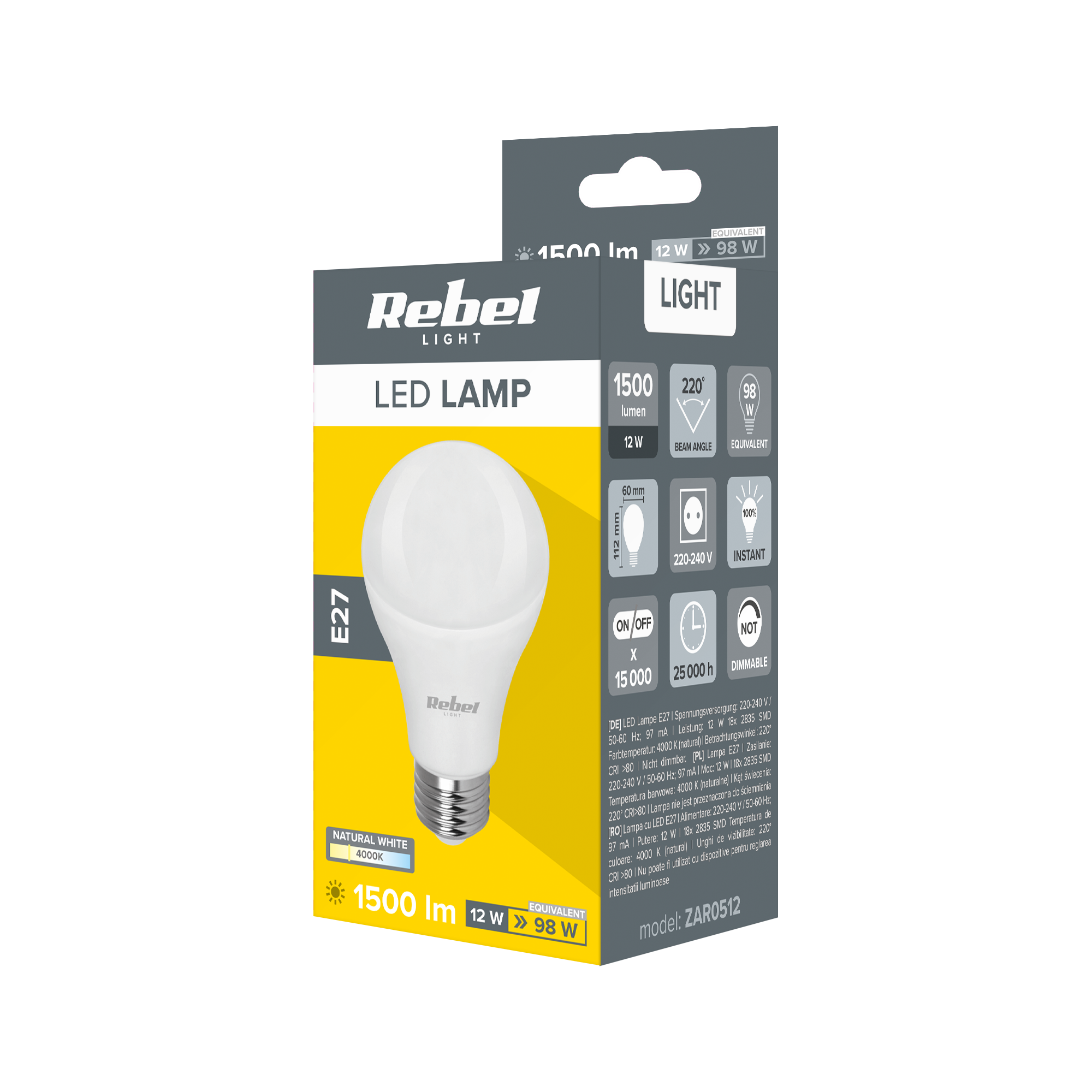 Lampa LED RebelŻarówka LED o mocy 12 W i 1500 lm z serii Rebel to gwarancja wysokiej wydajności i niskiego zużycia energii. Charakteryzuje się długą żywotnością oraz szerokim, 220-stopniowym kątem świecenia w naturalnym kolorze. Lampa LED marki Rebel zalicza się do klasy energetycznej E i jest zgodna z ostatnimi rozporządzeniami Komisji Europejskiej dotyczącymi etykietowania energetycznego źródeł światła oraz wymogów dotyczących ekoprojektu dla źródeł światła.