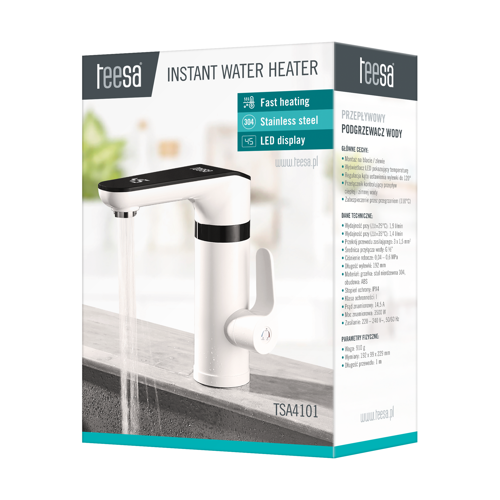 <h1>Elektryczny przepływowy podgrzewacz wody Teesa</h1><p>Przepływowy podgrzewacz Teesa sprawdzi się wszędzie tam, gdzie potrzebny jest szybki i wydajny dostęp do ciepłej wody bez konieczności stosowania dużych instalacji. Możesz wykorzystać go na działce, w domku letniskowym, garażu, a nawet w biurze. Urządzenie wyróżnia łatwy montaż na blacie lub zlewie, co umożliwia szybkie podłączenie do istniejącej instalacji wodnej i elektrycznej.</p>