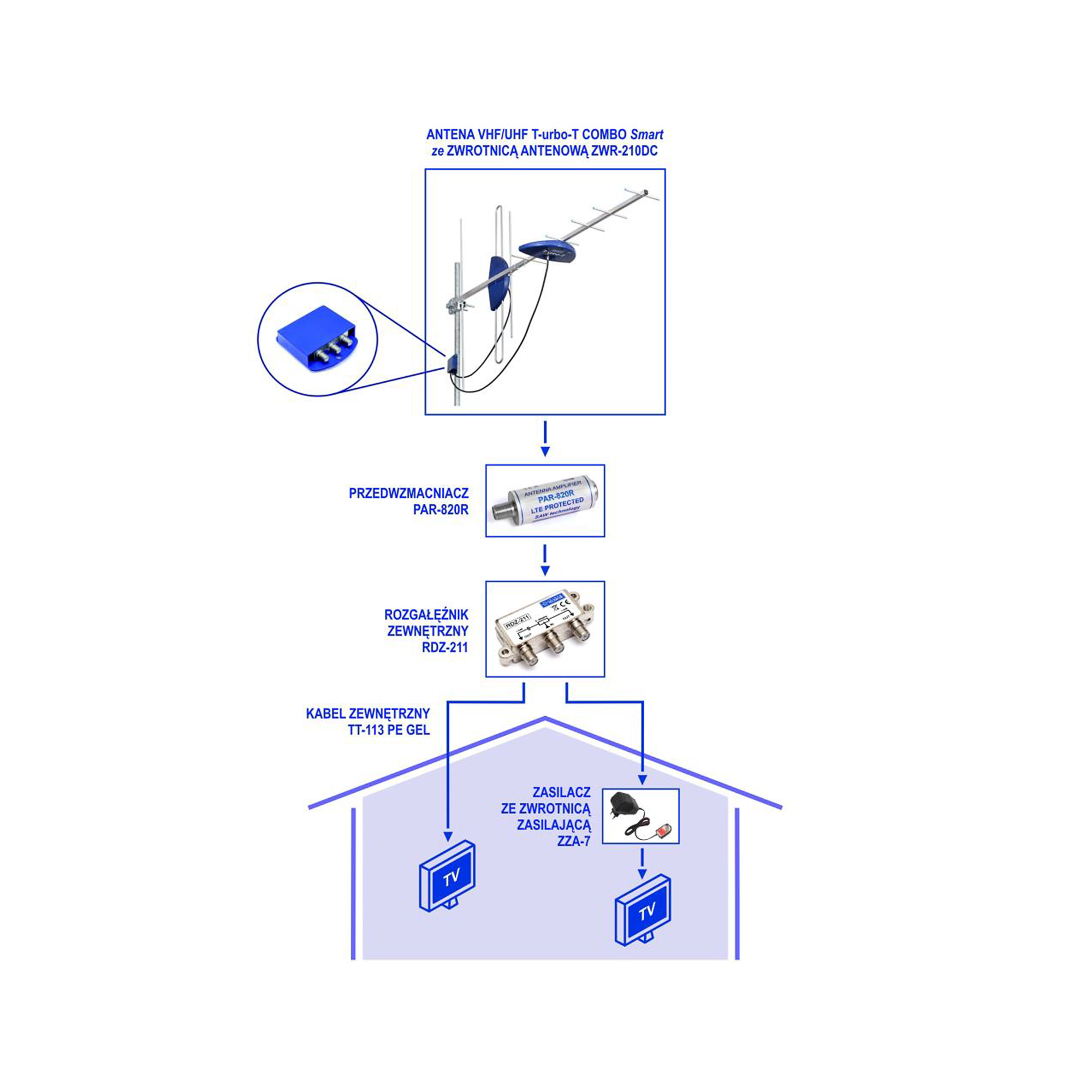 RDZ-211 to rozgałęźnik/sumator przeznaczony do stosowania w zbiorowych oraz indywidualnych instalacjach antenowych RTV. Jego zadaniem jest rozgałęzienie lub zsumowanie 2-sygnałów antenowych. RDZ-211 można zamontować w bryzgoszczelnej osłonie z ABS, dzięki czemu możliwe jest jego umieszczenie na zewnątrz pomieszczenia np. na maszcie antenowym. Dla zapewnienia prawidłowej eksploatacji sprzętu należy zwrócić szczególną uwagę na jego właściwą instalację i podłączenie. Urządzenie może być stosowane w sytuacjach gdy poziom sygnału jest na tyle duży, że jego podział a co za tym idzie obniżenie poziomu o 4dB, nie spowoduje, że finalny poziom w gnieździe abonenckim będzie poniżej 51dBuV (minimum na podstawie normy PN-EN 60728-1).