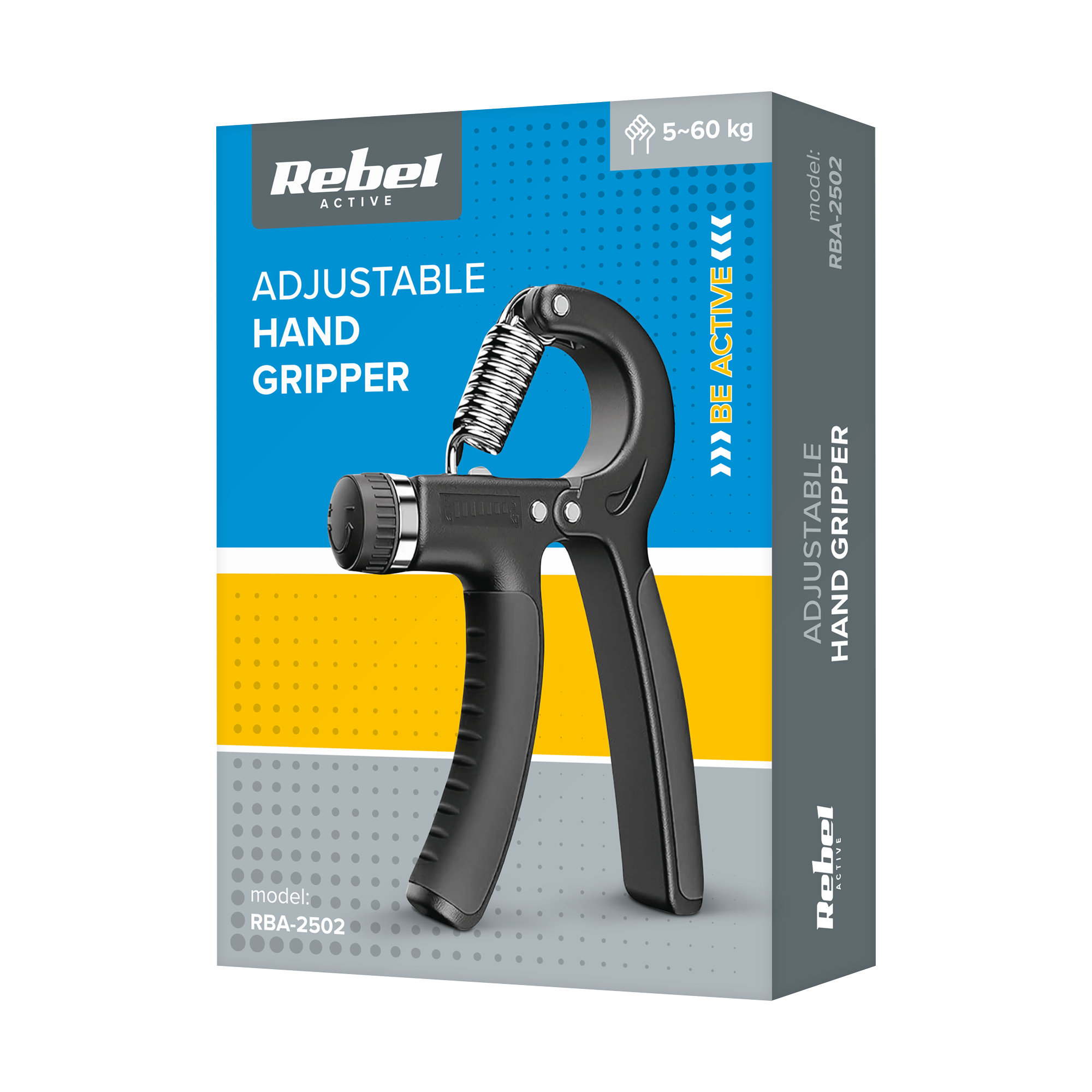 <h2>Ściskacz do ćwiczenia rąk, regulowany 5-60 kg, REBEL ACTIVE</h2><p>Ściskacz REBEL ACTIVE to doskonałe narzędzie dla każdego, kto pragnie skutecznie wzmacniać mięśnie rąk i poprawiać ich kondycję. Dzięki możliwości regulacji oporu od 5 do 60 kg, oferuje wszechstronność, która odpowiada zarówno początkującym, jak i zaawansowanym użytkownikom.</p>