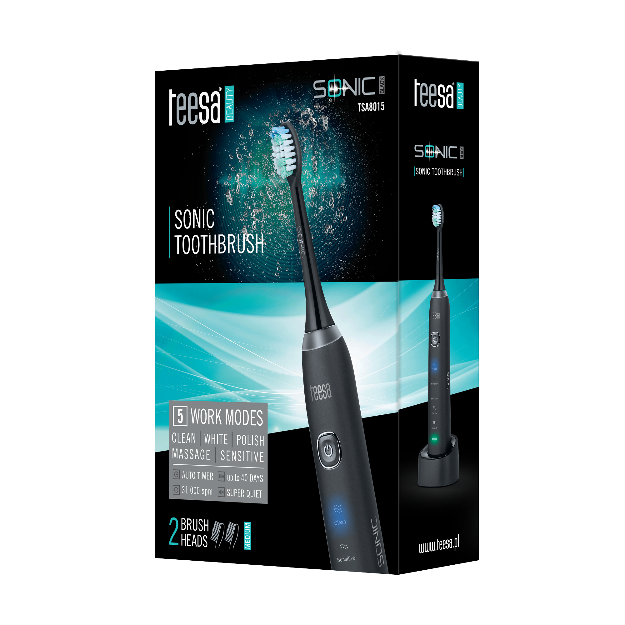 31 000 ruchów pulsacyjnychPrzekonaj się o skuteczności technologii sonicznej! Szczoteczka Teesa SONIC Black wykonuje kilkakrotnie więcej ruchów na minutę w porównaniu do obrotowej szczoteczki elektrycznej. Oznacza to, że znacznie dokładniej usuwa płytkę nazębną oraz oczyszcza przestrzenie między zębami.