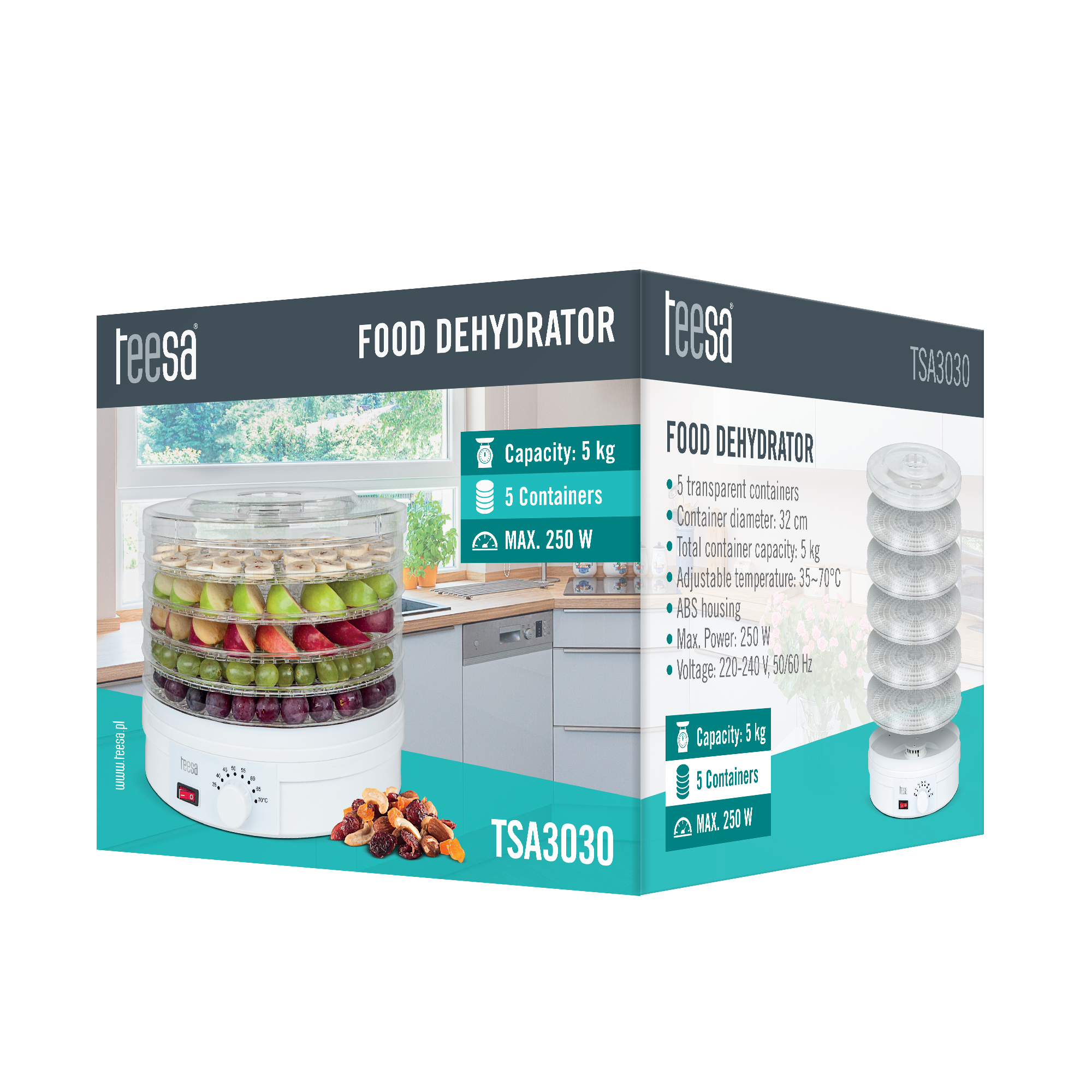 5 sitSuszarka TSA3030 została wyposażona w pięć sit o średnicy 32 cm, które pozwolą na suszenie nawet 5 kilogramów żywności. Teraz, niezależnie od pory roku, możesz cieszyć się dawką naturalnych witamin lub zaskoczyć znajomych zdrową przekąską podczas wspólnych spotkań.