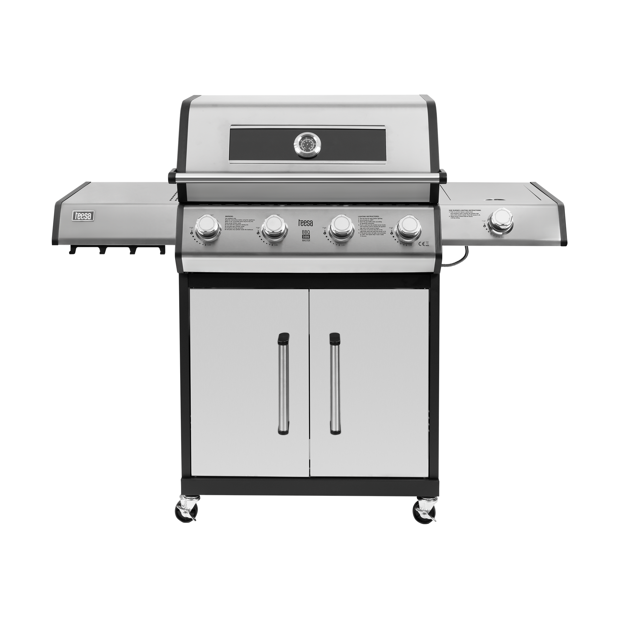 <h2>Szafka na butlę </h2><p>Grill Teesa BBQ 5006 MASTER posiada przestronną szafkę, która umożliwia bezpieczne przechowywanie butli gazowej o pojemności do 11 kg. Dzięki temu gaz pozostaje ukryty, co poprawia estetykę i bezpieczeństwo użytkowania. Solidne drzwi ze stali nierdzewnej ułatwiają dostęp, a stabilna konstrukcja na kółkach pozwala na wygodne przemieszczanie grilla.</p>