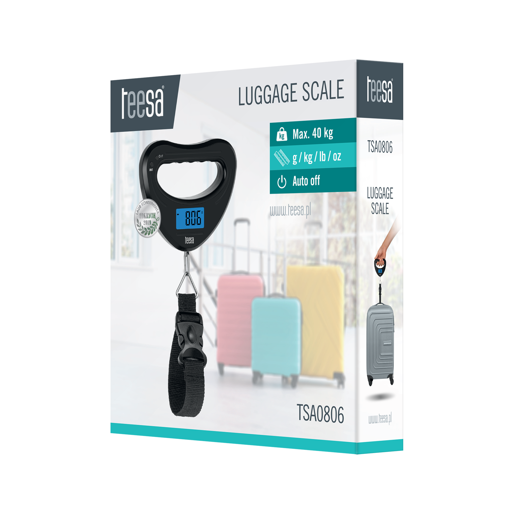 Waga do bagażu Teesa TSA0806Na lotnisku podczas odprawy zawsze nerwowo spoglądasz na wagę w obawie, że przekroczysz limit bagażu? Zaopatrz się w wagę do walizek Teesa i zapomnij o ważeniu toreb wagą łazienkową. Maksymalne obciążenie wagi to 40 kg, dlatego z łatwością zważysz nawet bagaż rodzinny. Urządzenie posiada wygodny, ergonomiczny uchwyt, a także czytelny wyświetlacz LCD, dzięki któremu z łatwością zobaczysz wynik pomiaru. Waga walizkowa Teesa jest lekka i nie zajmuje dużo miejsca, dlatego możesz zabierać ją ze sobą w podróże.
