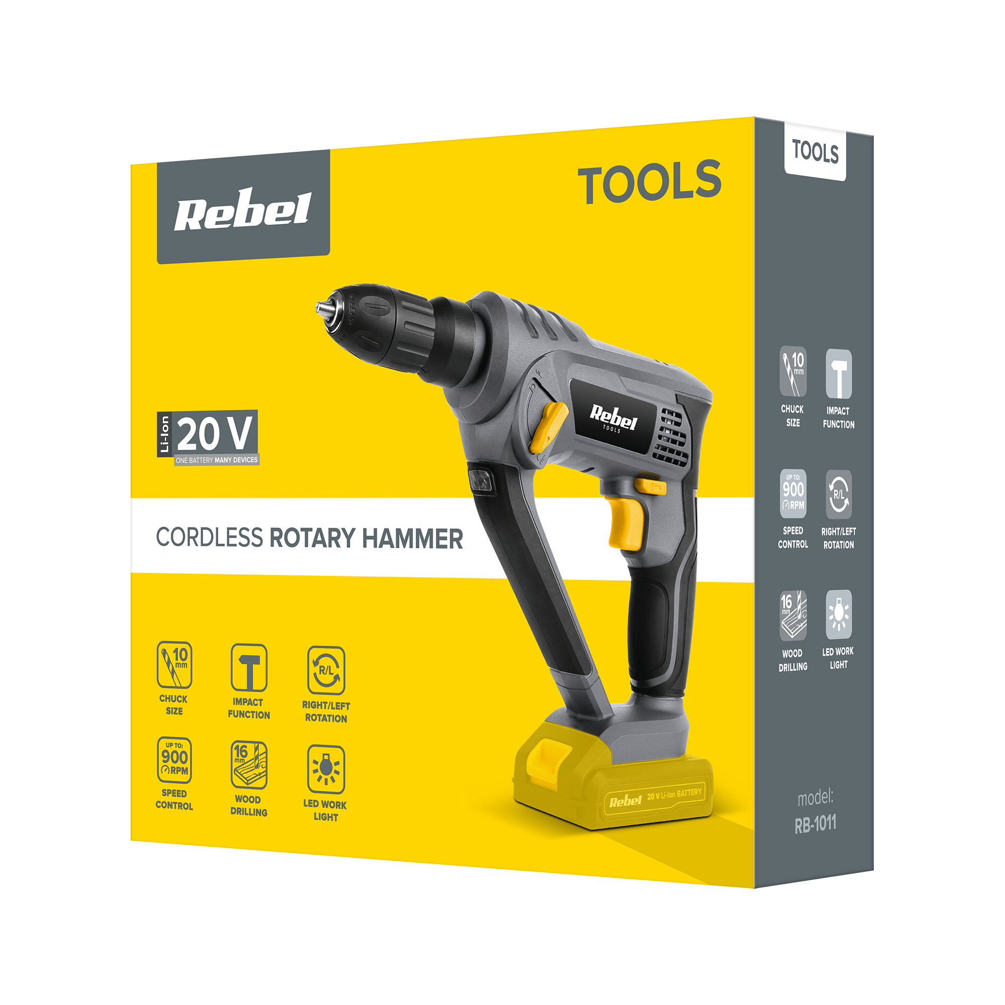 <h2>Elastyczne zasilanie</h2><p>RB-1011 to wiertarka akumulatorowa, a w zależności od swoich potrzeb możesz dokupić <b>jeden z dwóch modeli – 2 Ah (RB-2001) lub 4 Ah (RB-2002)</b>. Zaletą tych akumulatorów jest to, że są one uniwersalne i pasują do większości urządzeń z serii Rebel Tools.</p>
