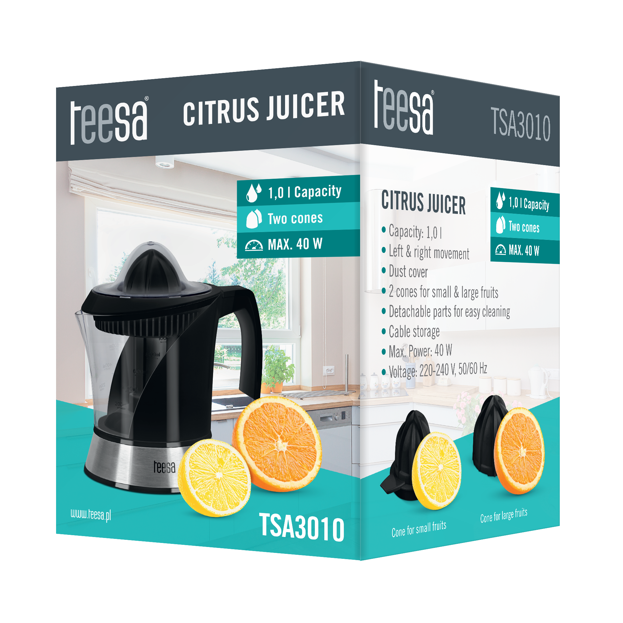 <p> Czarna obudowa, wykończona elementami szczotkowanej stali nierdzewnej oraz przezroczysta strefa na sok sprawią, że wyciskarka Teesa będzie nie tylko praktycznym urządzeniem kuchennym, ale również eleganckim elementem wystroju. Dzięki pokrywie chroniącej przed kurzem oraz wyjmowanym częściom, które ułatwiają mycie, można w bardzo łatwy sposób zachować czystość urządzenia.</p>