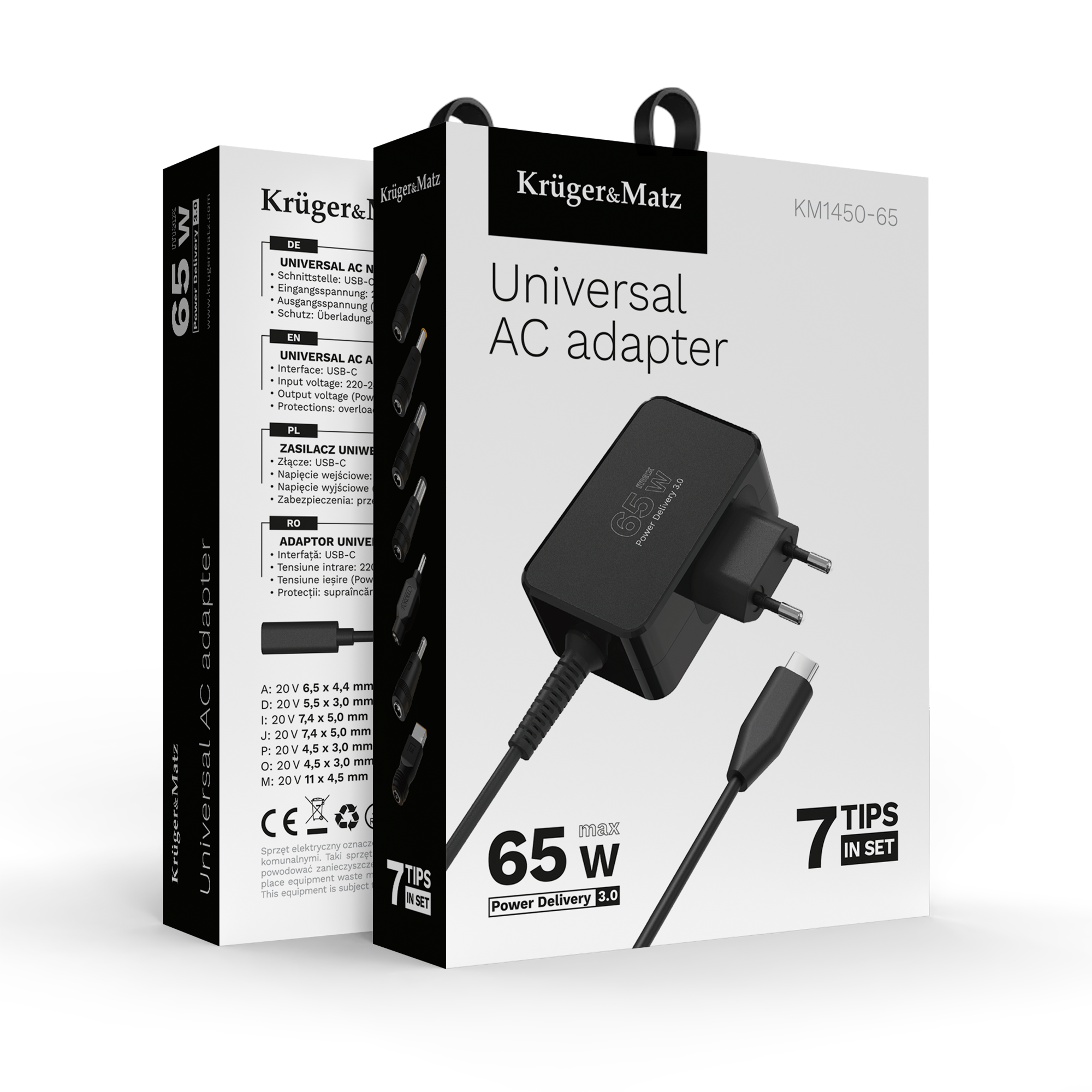 <h1>Zasilacz uniwersalny Kruger&Matz 65 W z funkcją Power Delivery </h1><p>Uniwersalny zasilacz do laptopa Kruger&Matz to idealne rozwiązanie w domu, biurze i podróży. Sprawdzi się, gdy Twój oryginalny zasilacz ulegnie awarii, zgubi się lub potrzebujesz jednego urządzenia do kilku laptopów. Dzięki wymiennym końcówkom i złączom USB-C możesz ładować wiele modeli komputerów oraz inne urządzenia mobilne – wygodnie i bezpiecznie.</p>