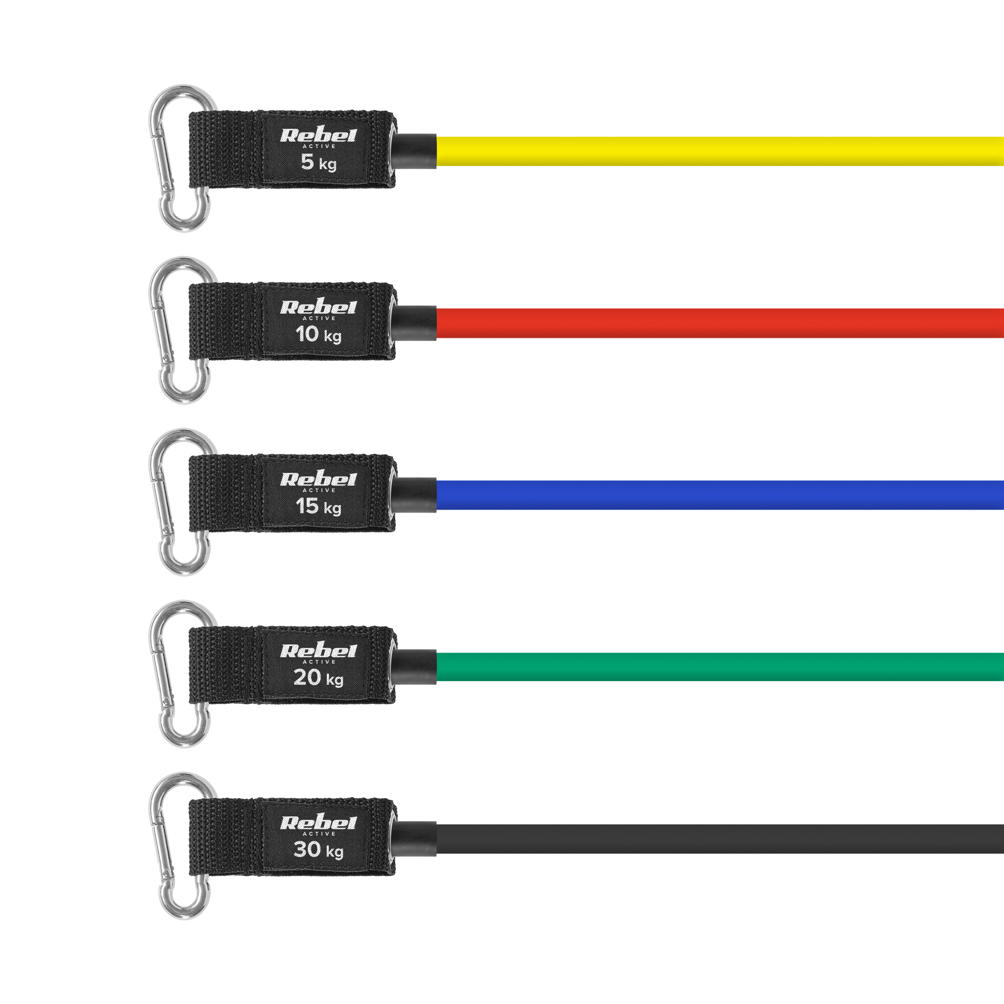 <h2>Zestaw 5 gum oporowych do ćwiczeń 5-30 kg Rebel Active </h2><p>Zestaw gum oporowych Power Tube Set od REBEL ACTIVE to doskonałe rozwiązanie dla osób, które pragną efektywnie trenować w domu lub w podróży. Dzięki zróżnicowanym poziomom oporu oraz kompletnemu zestawowi akcesoriów, możliwe jest dostosowanie intensywności ćwiczeń do indywidualnych potrzeb.</p>
