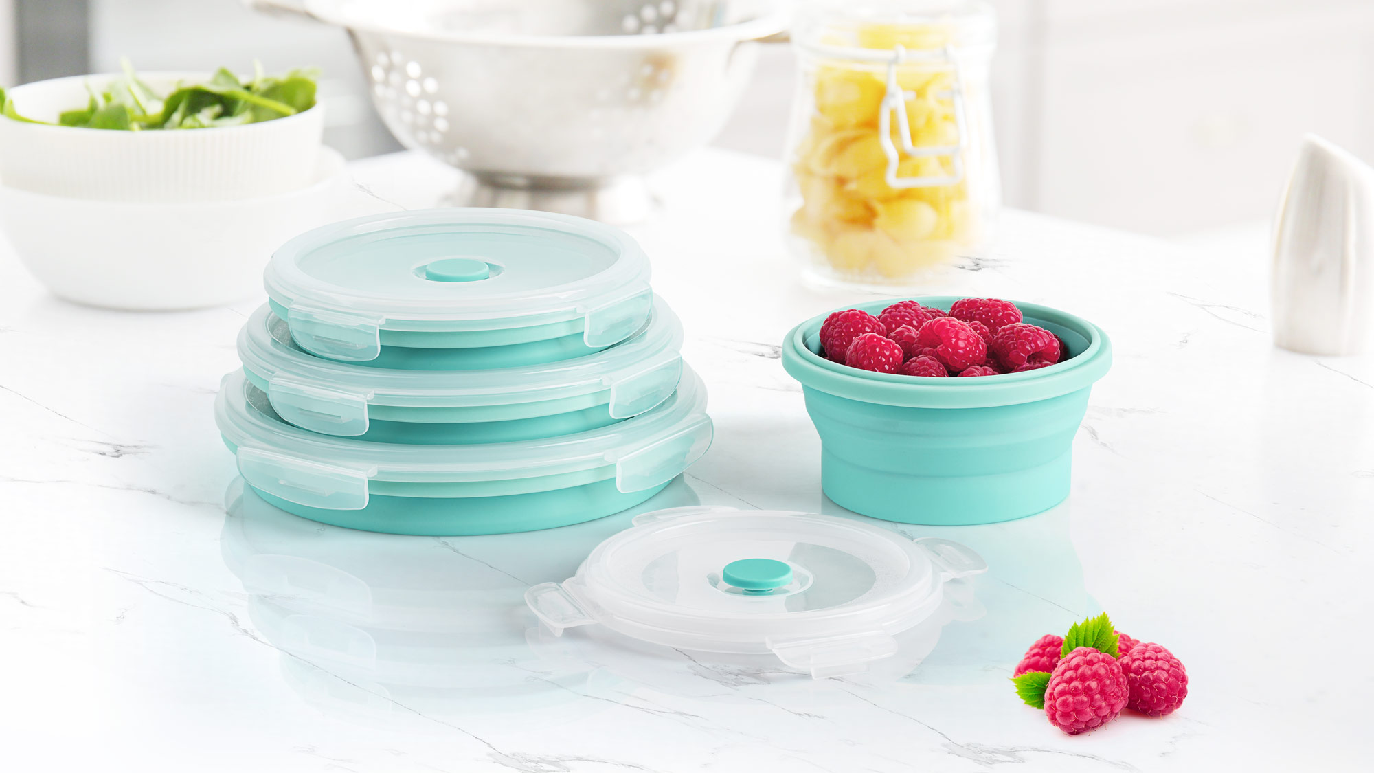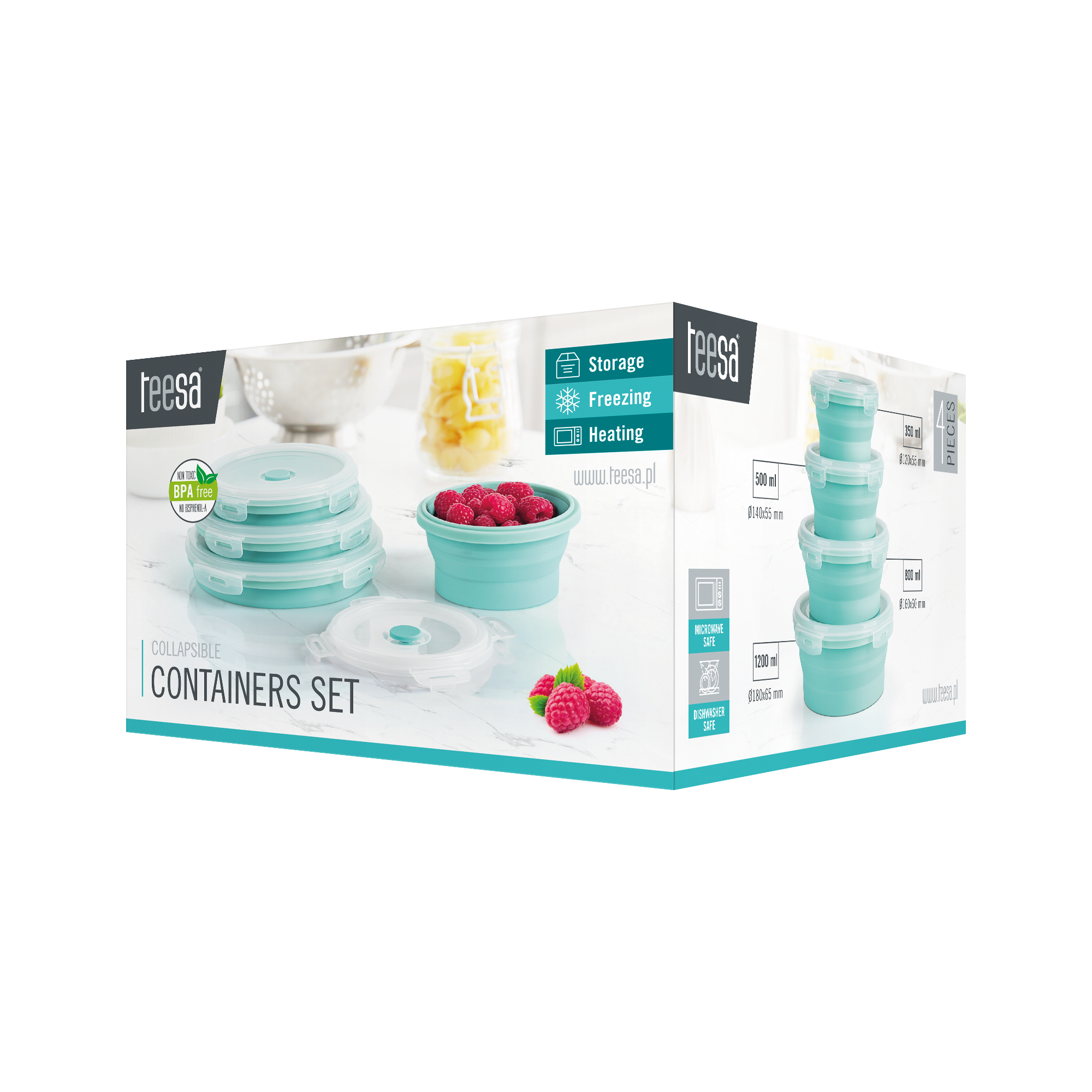 <h2>Kompaktowe, oszczędź miejsce i usprawnij organizację</h2><p>Nie masz miejsca na zbędne przybory? Mając pod ręką praktyczny, uniwersalny komplet pojemników Teesa, zdecydowanie lepiej zorganizujesz przestrzeń w swojej kuchni. Wszystko za sprawą składanej konstrukcji, dzięki której zajmują dużo mniej miejsca niż tradycyjne pojemniki plastikowe na żywność.</p>