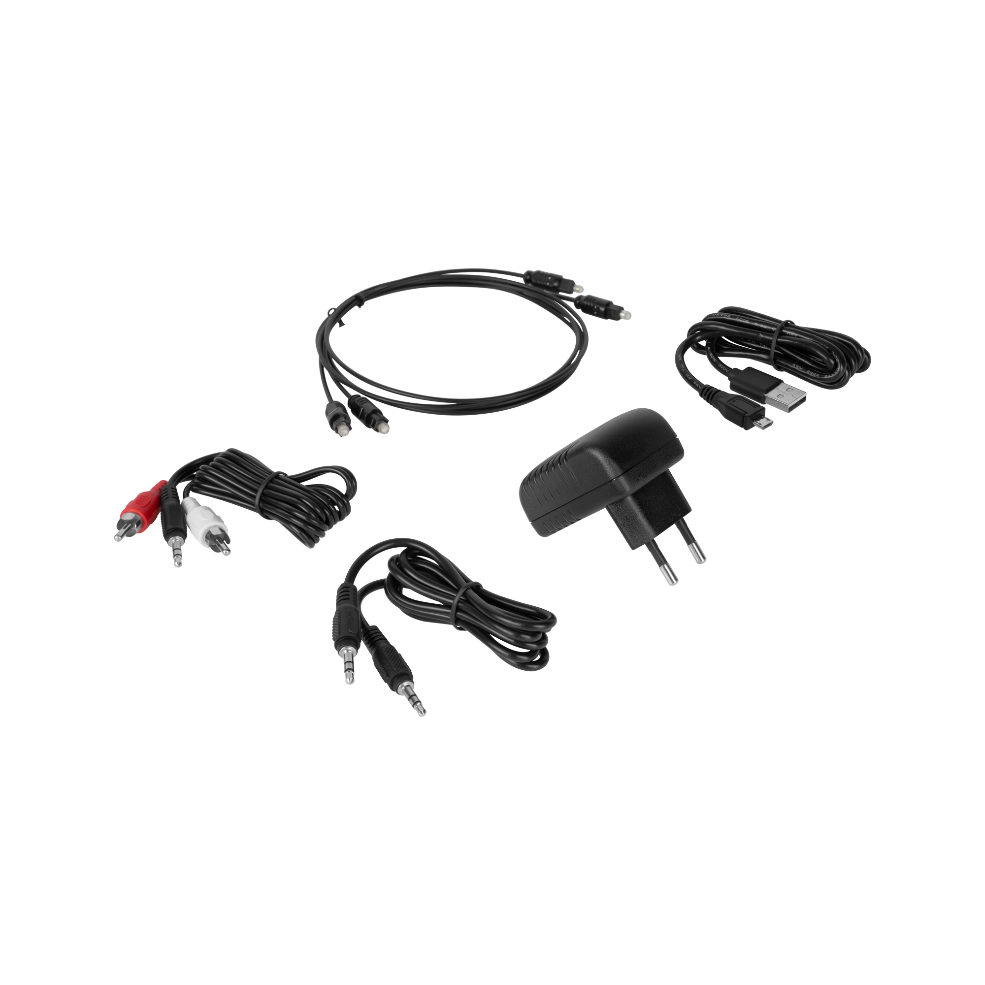 W zestawie: Zasilacz, kabel USB<->micro USB, kabel jack<->jack, kabel jack<->2x RCA, 2x kabel optyczny
