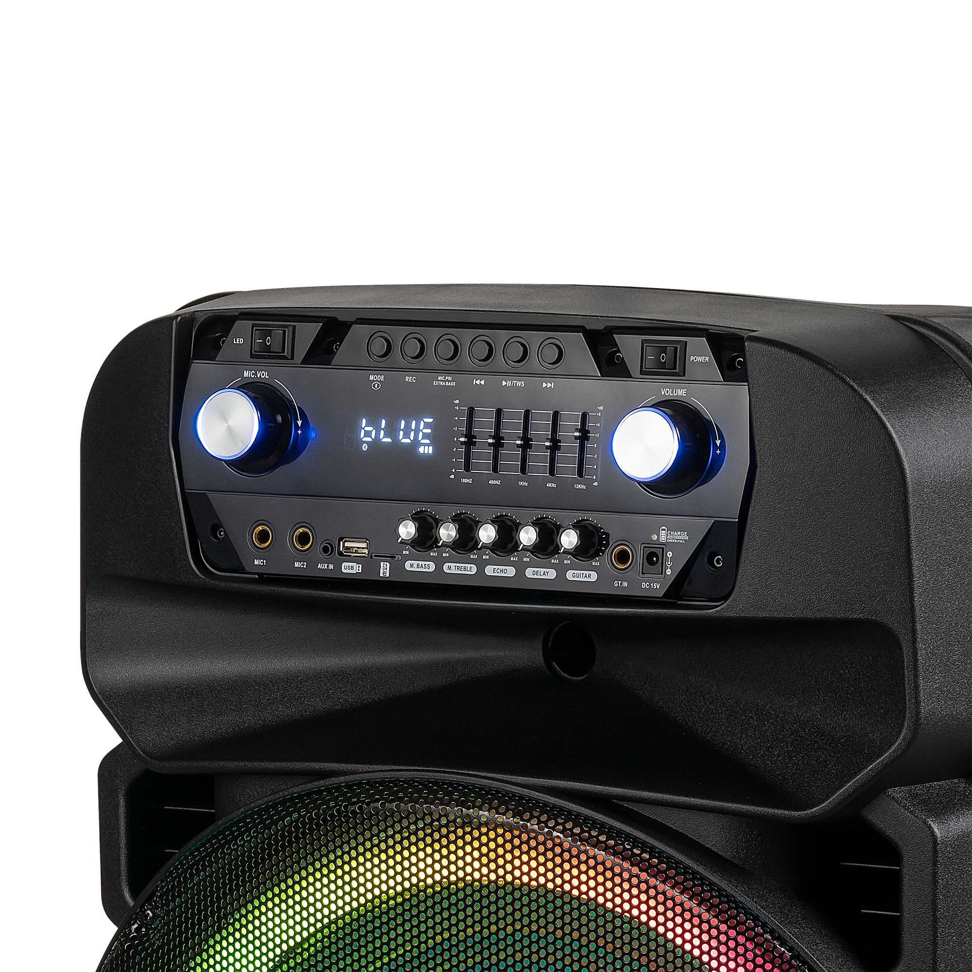Zawładnij muzykąZwróciłeś uwagę na szereg pokręteł znajdujących się na panelu sterującym kolumny? Pozwalają one nie tylko na dostosowanie głośności muzyki, mikrofonów i gitary, ale także umożliwiają regulację pogłosu oraz tonów niskich i wysokich.