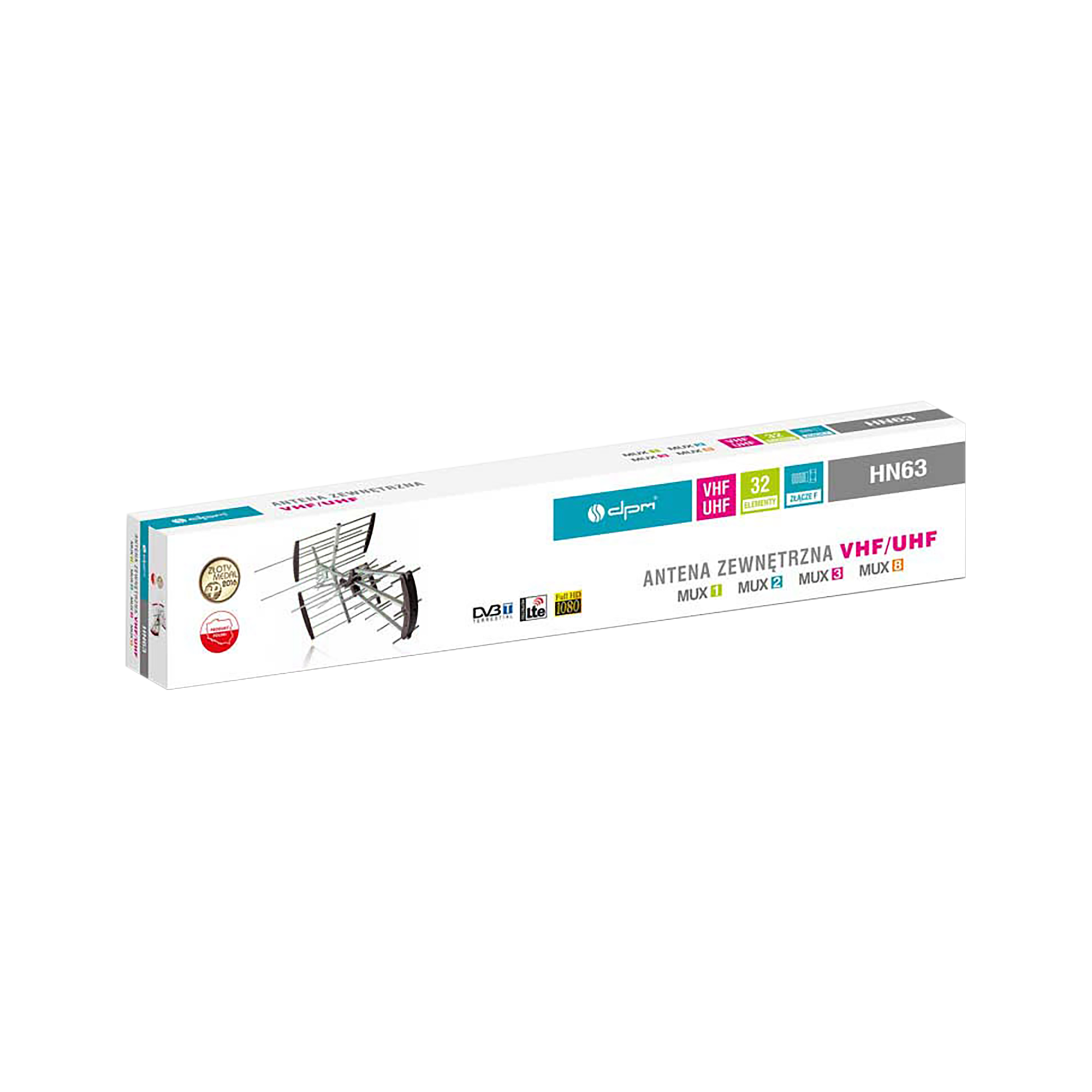 *Antena otwarta na pasmo VHF, jednak jest zysk w tym zakresie jest niewielki, przez co odbiór kanałów z pasma VHF może odbywać się tylko przy mocnych sygnałach. Do odbioru VHF zalecamy anteny TurboT V lub TurboT V3 oraz zwrotnicę ZWR210DC, która skutecznie sygnał z obu anten do jednego kabla.