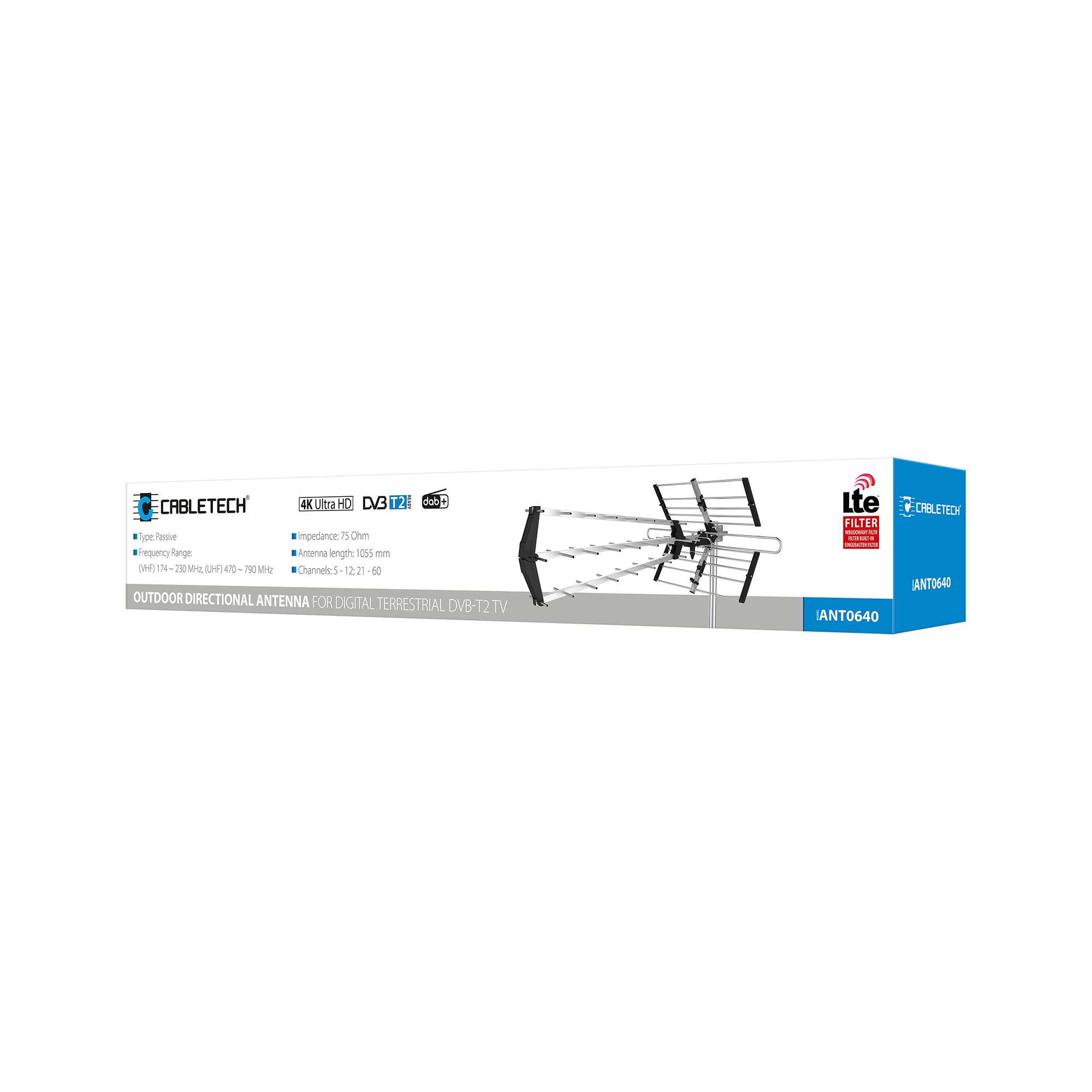 Krystaliczny sygnałCo więcej dzięki obsłudze pasma VHF, antena Calbletech umożliwia odbiór kanałów naziemnej telewizji cyfrowej, umieszczonych na ósmym multipleksie MUX 8. Zastosowany w tym modelu filtr LTE niweluje zakłócenia sieci LTE, które wpływają na jakość sygnału telewizji naziemnej.