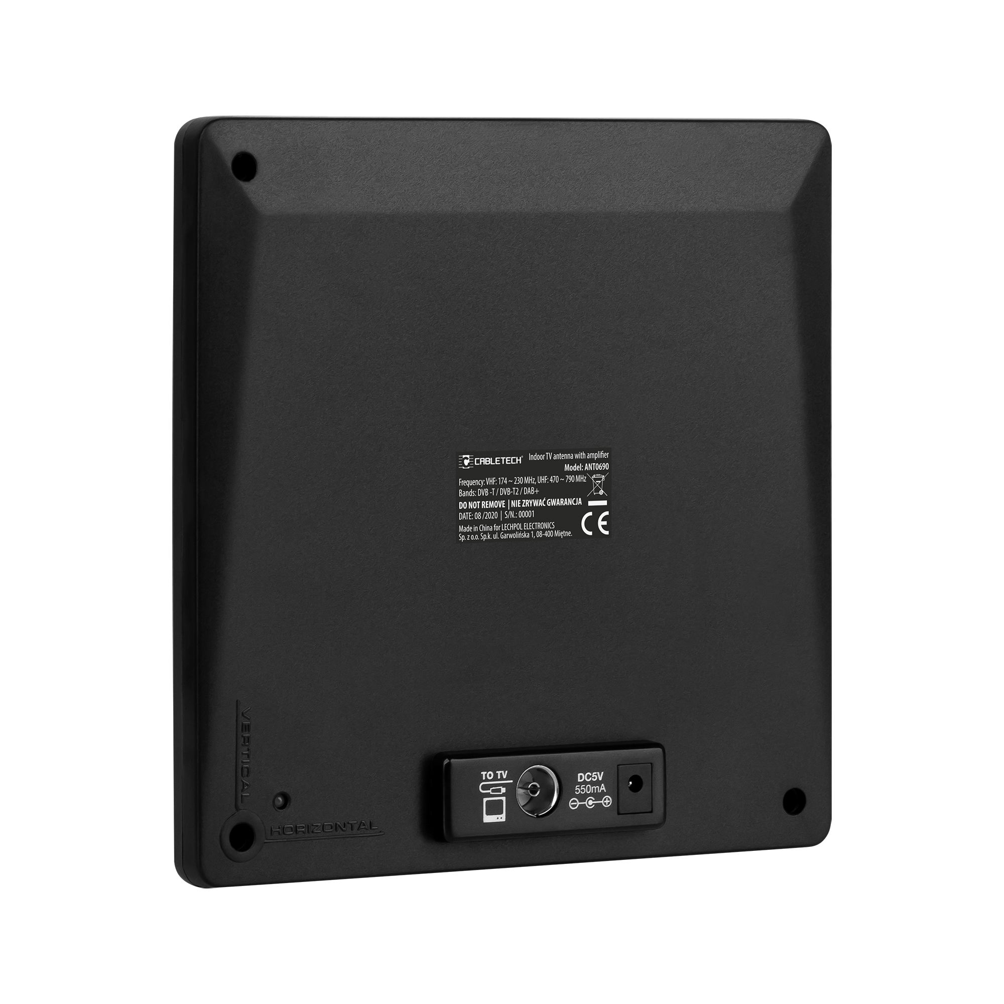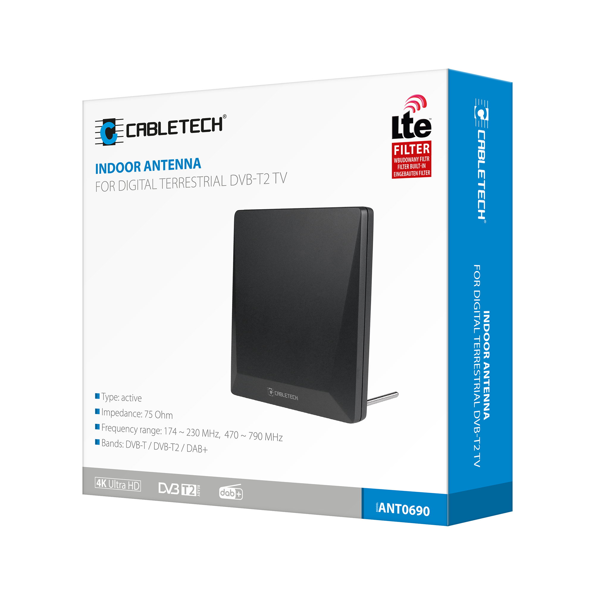 Antena pokojowa Cabletech do cyfrowej telewizji naziemneij DVB-T2Antena wewnętrzna Cabletech zapewnia idealny odbiór sygnału telewizji cyfrowej DVB-T2 oraz analogowego w zakresie VHF i UHF. Obsługa pasma VHF sprawia, że antena Cabletech umożliwia odbiór kanałów naziemnej telewizji cyfrowej, umieszczonych na multipleksie MUX 8. Zastosowany w tym modelu filtr LTE niweluje zakłócenia sieci LTE, które wpływają na jakość sygnału telewizji naziemnej.