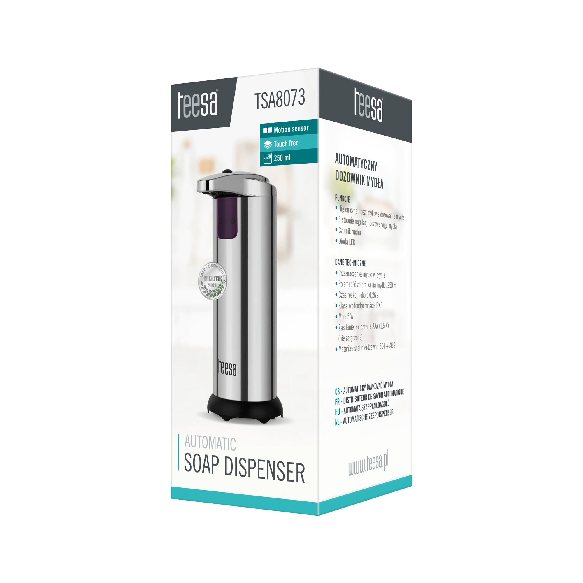 Automatyczny dozownik mydła Teesa TSA8073Brak konieczności naciskania jakiegokolwiek przycisku sprawia, że bezdotykowe dozowniki do mydła są niezwykle higieniczne i bez wątpienia stanowią absolutny niezbędnik w każdym miejscu użytku publicznego, np. galerii handlowej czy kinie. To nie musi być jednak jedyne zastosowanie takiego urządzenia, bo wybierając model, który dodatkowo posiada stylowy wygląd, będzie on stanowił doskonałe doposażenie nowoczesnego biura albo domowej łazienki. Właśnie taki jest automatyczny dozownik do mydła marki Teesa.