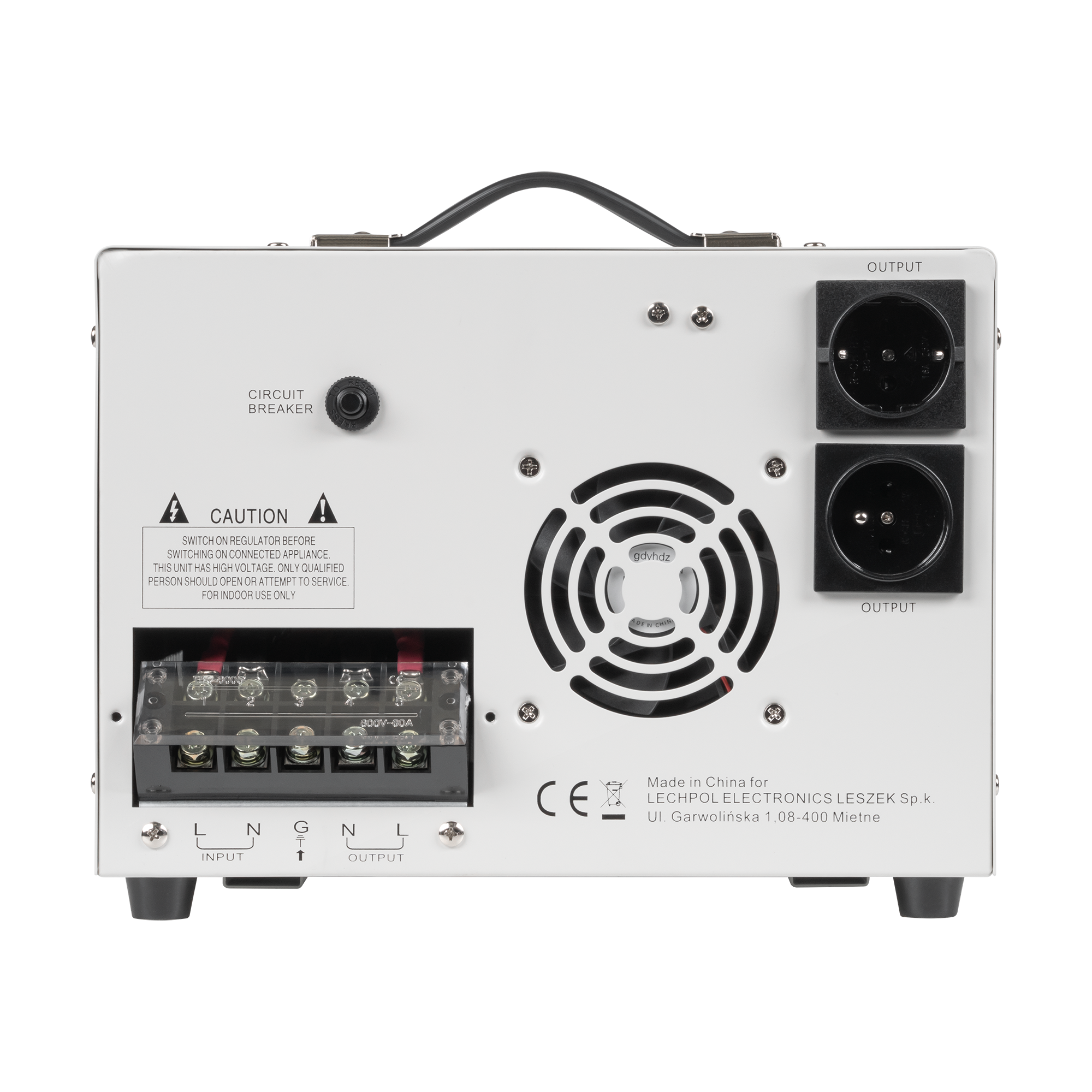 Ochrona przed zakłóceniamiStabilizator posiada zabezpieczenia przed zwarciami, przegrzaniem i zbyt wysokim napięciem. Funkcje te pomagają w ochronie podłączonych urządzeń przed nagłymi zmianami parametrów sieci elektrycznej.