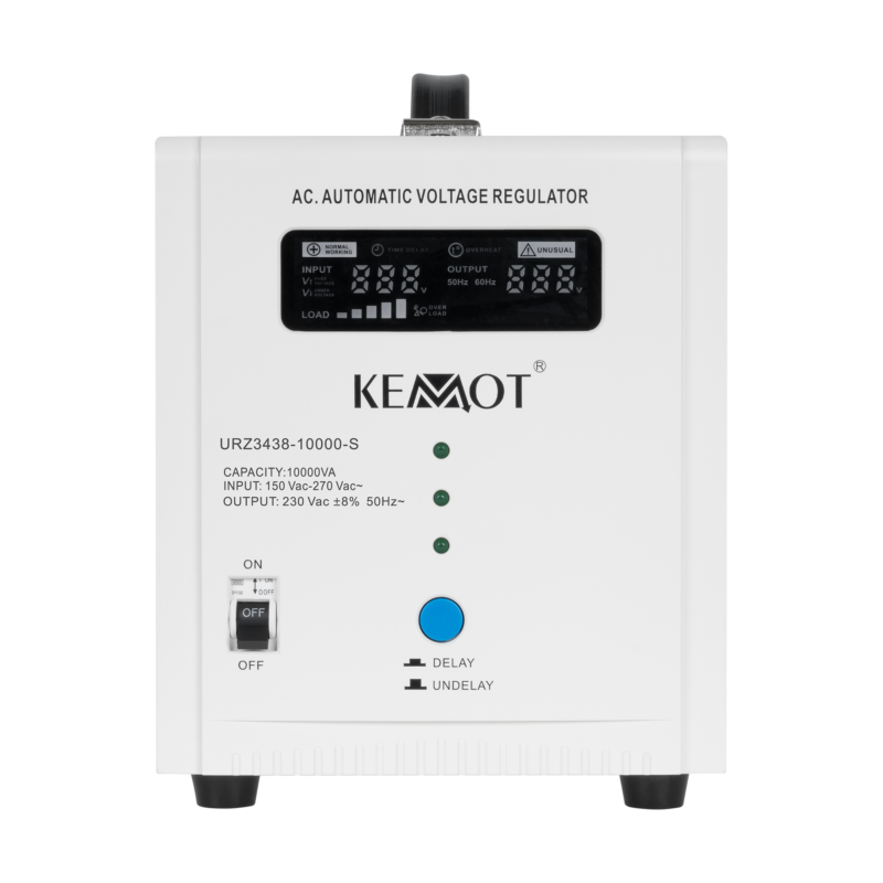 Funkcja opóźnienia DELAYJeśli potrzebujesz stabilizatora napięcia do urządzeń posiadających duży chwilowy prąd rozruchowy wybierz model wyposażony w funkcję opóźnienia załączenia DELAY. KEMOT SER-10000-S, został wyposażony w przycisk opóźnienia załączania DELAY w zakresie od 6 do 180 sekund, co obniży ryzyko jego uszkodzenia, gdy podłączone do niego urządzenia mają duży chwilowy prąd rozruchowy. Ponadto stabilizator SER-10000-S posiada zabezpieczenia przed zbyt wysokim i niskim napięciem, przeciążeniem, przegrzaniem i zwarciem.