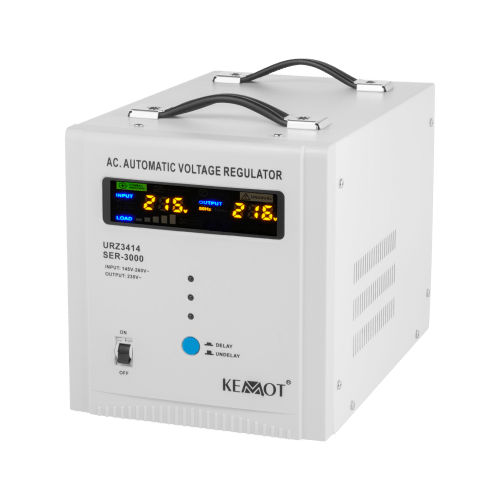 Jeśli potrzebujesz stabilizatora napięcia do urządzeń posiadających duży chwilowy prąd rozruchowy wybierz model wyposażony w funkcję opóźnienia załączenia DELAY. KEMOT SER-10000-S, został wyposażony w przycisk opóźnienia załączania DELAY w zakresie od 6 do 180 sekund, co obniży ryzyko jego uszkodzenia, gdy podłączone do niego urządzenia mają duży chwilowy prąd rozruchowy. Ponadto stabilizator SER-10000-S posiada zabezpieczenia przed zbyt wysokim i niskim napięciem, przeciążeniem, przegrzaniem i zwarciem.