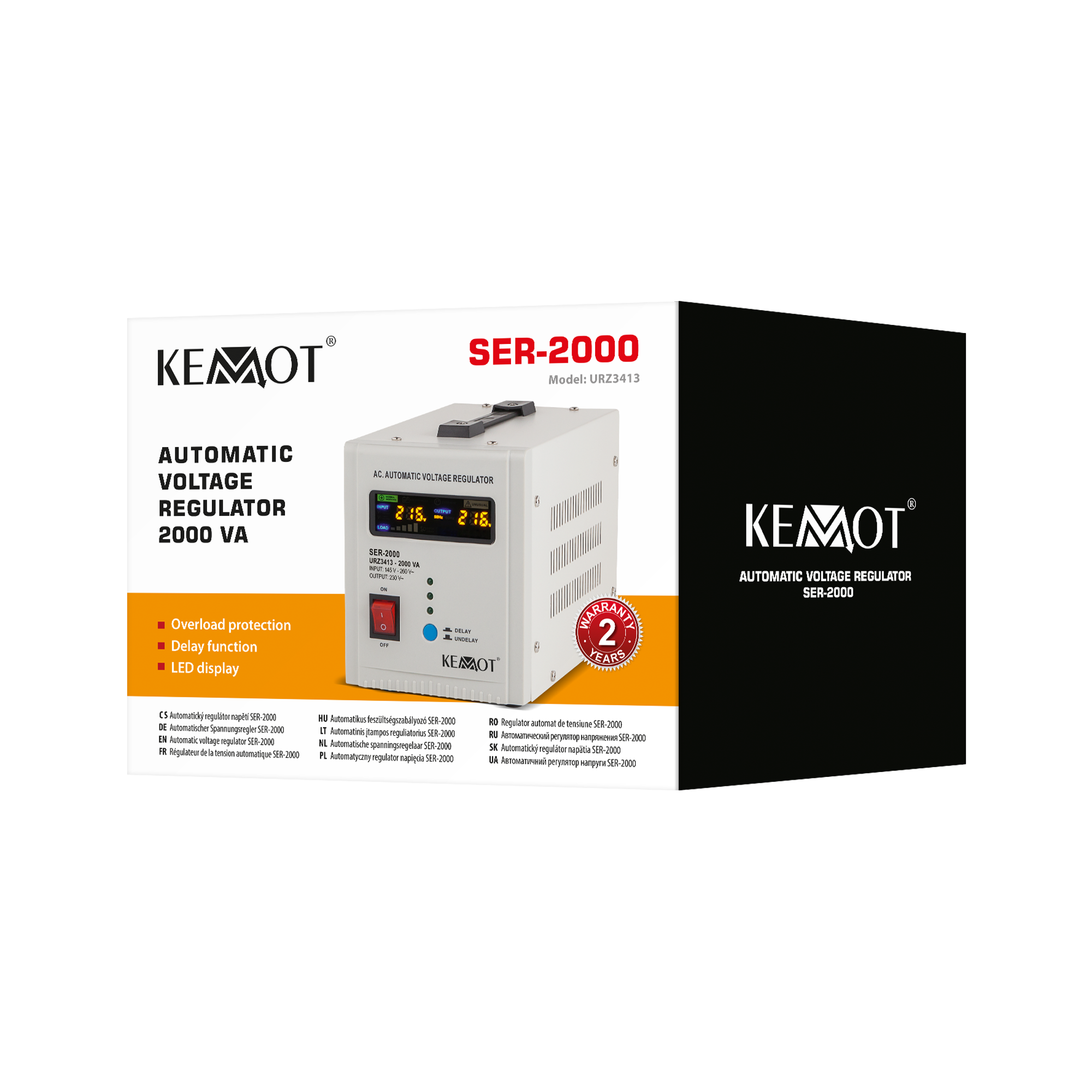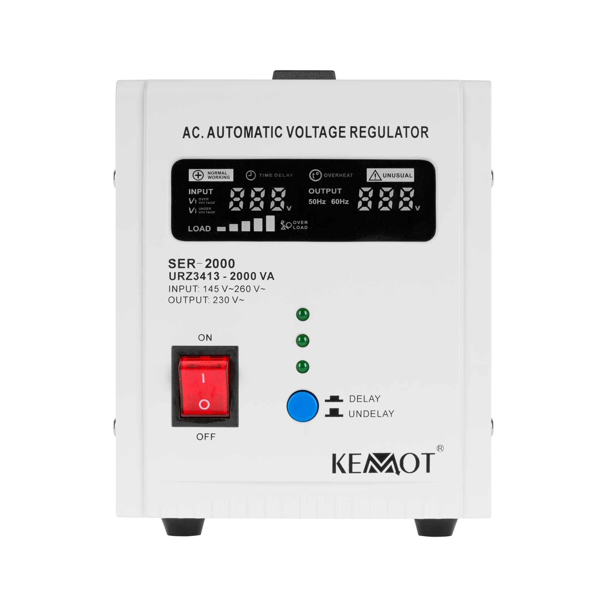 Funkcja opóźnienia DELAYJeśli potrzebujesz stabilizatora napięcia do urządzeń posiadających duży chwilowy prąd rozruchowy wybierz model wyposażony w funkcję opóźnienia załączenia DELAY. KEMOT SER-2000, został wyposażony w przycisk opóźnienia załączania DELAY w zakresie od 6 do 180 sekund, co obniży ryzyko jego uszkodzenia, gdy podłączone do niego urządzenia mają duży chwilowy prąd rozruchowy. Ponadto stabilizator SER-2000 posiada zabezpieczenia przed zbyt wysokim i niskim napięciem, przeciążeniem, przegrzaniem i zwarciem.