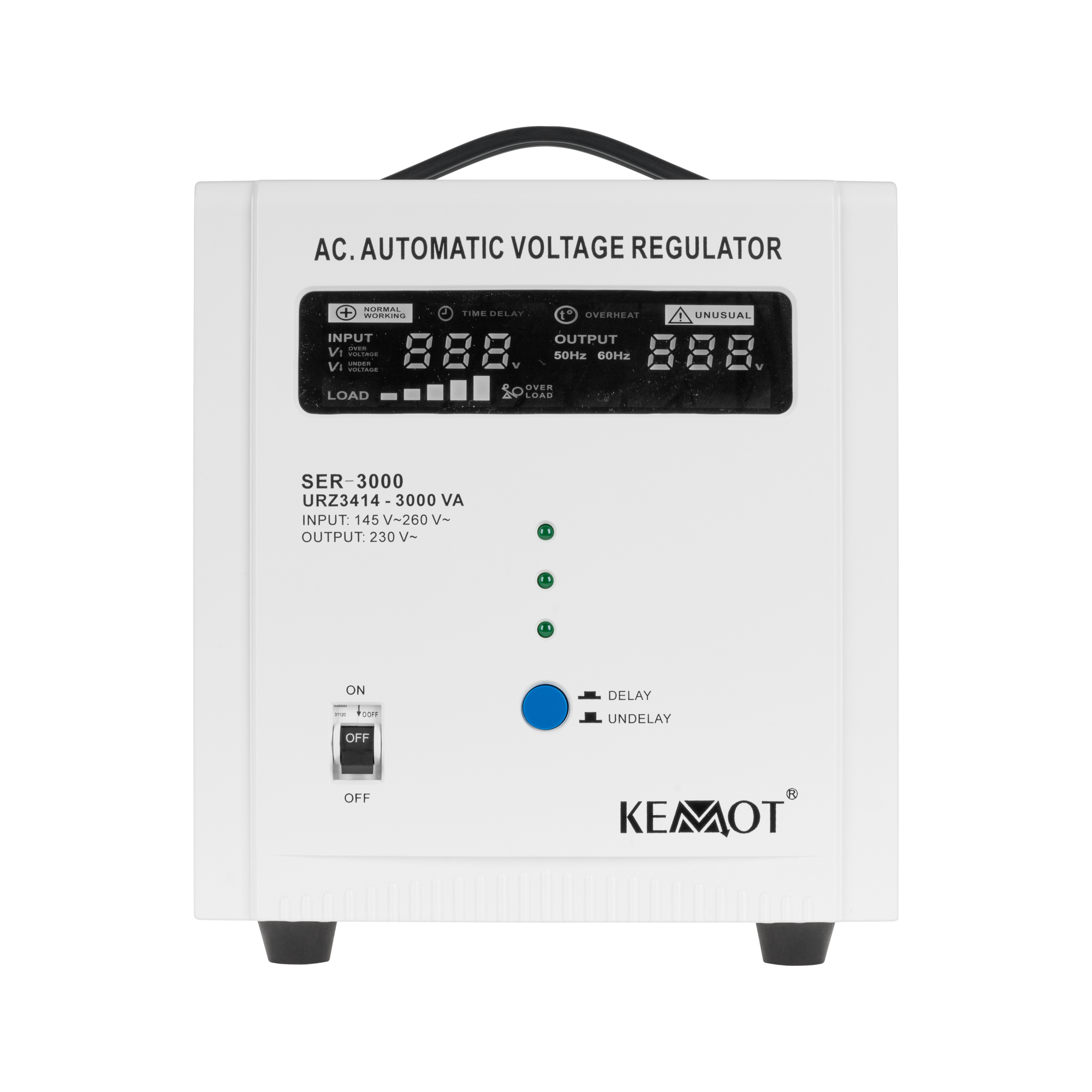 Funkcja opóźnienia DELAYJeśli potrzebujesz stabilizatora napięcia do urządzeń posiadających duży chwilowy prąd rozruchowy wybierz model wyposażony w funkcję opóźnienia załączenia DELAY. KEMOT SER-3000, został wyposażony w przycisk opóźnienia załączania DELAY w zakresie od 6 do 180 sekund, co obniży ryzyko jego uszkodzenia, gdy podłączone do niego urządzenia mają duży chwilowy prąd rozruchowy. Ponadto stabilizator SER-3000 posiada zabezpieczenia przed zbyt wysokim i niskim napięciem, przeciążeniem, przegrzaniem i zwarciem.