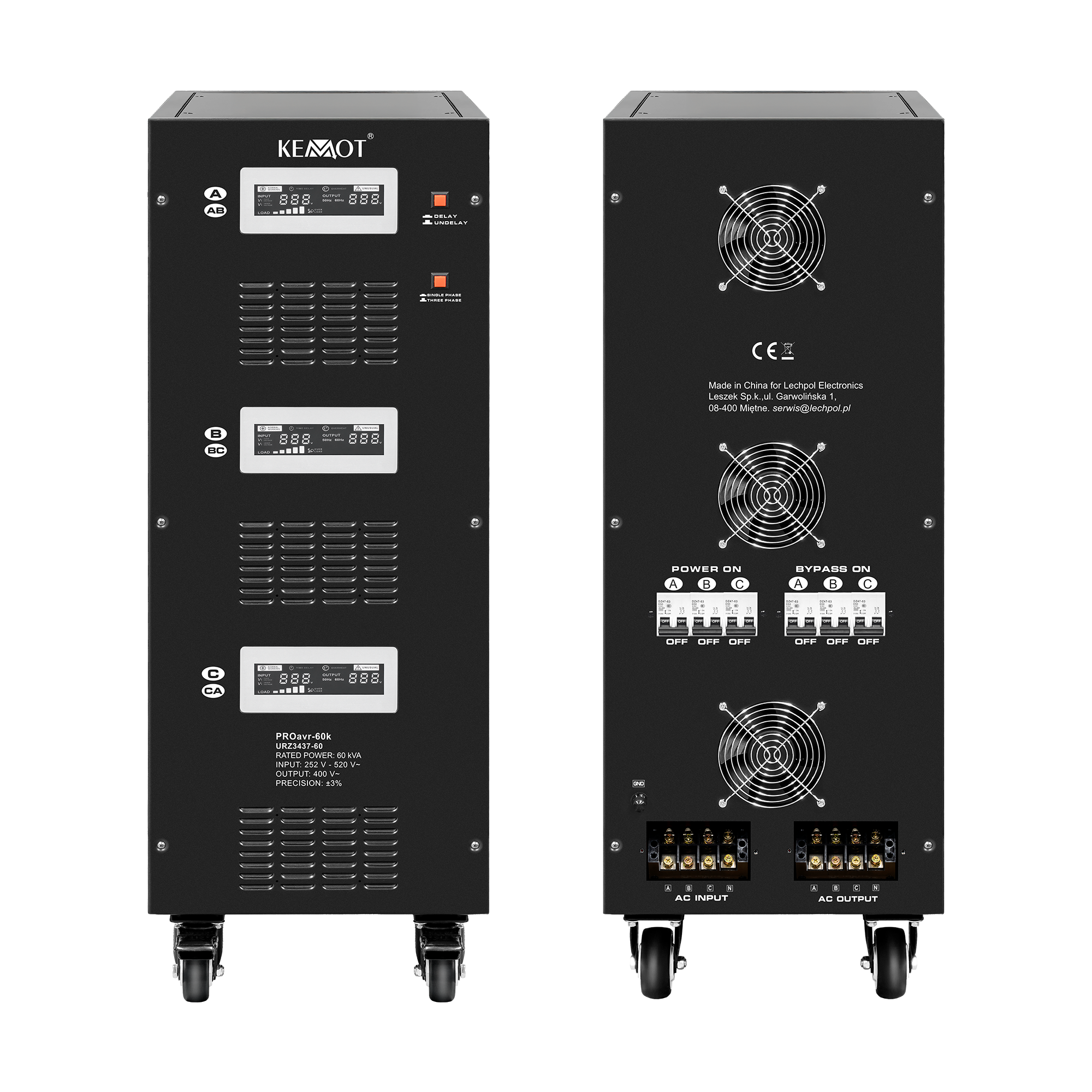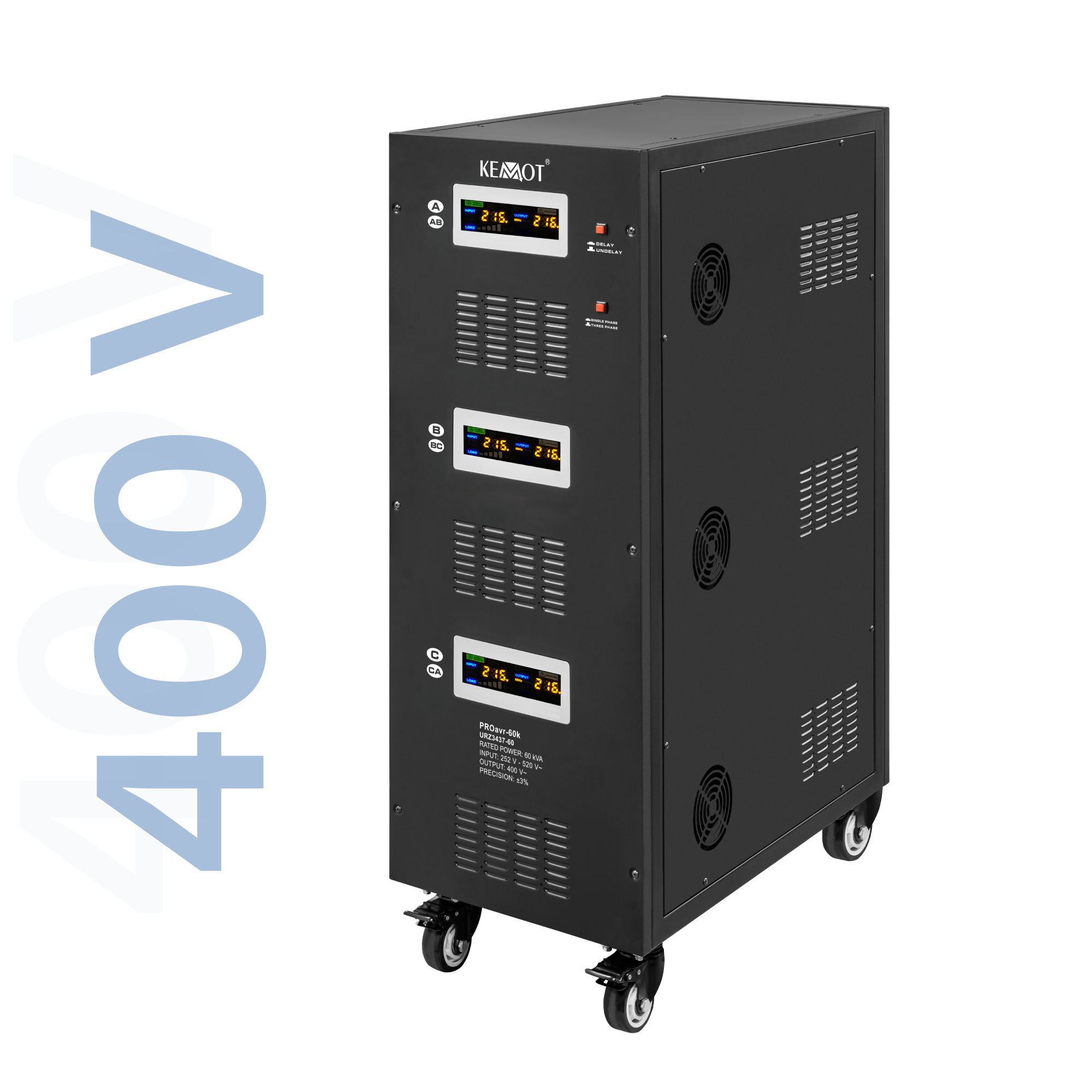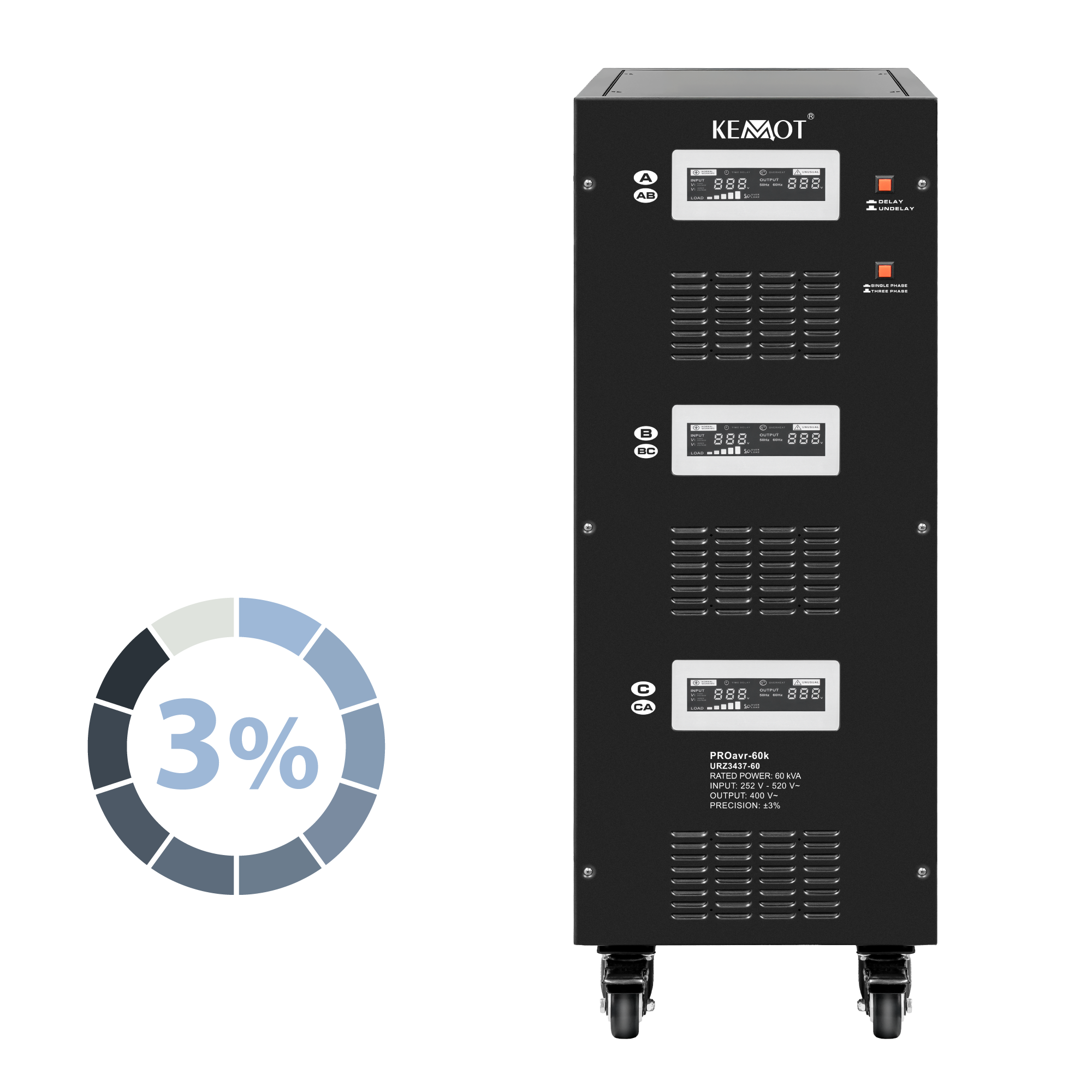 Zabezpiecz swoje urządzenia przed skokami napięciaW trybie jednofazowym każda z faz może pracować niezależnie od siebie. Niezależnie od obciążenia sieci i wahań napięcia wyjściowego, stabilizator KEMOT PROavr-60k utrzymuje je na poziomie 230 V ±3%, pozwalając na wydajną pracę wszystkich urządzeń, w tym tych wrażliwych na jakość napięcia sieci. Regulacja odbywa się automatycznie, co zapewnia wysoką dokładność napięcia wyjściowego. Błąd w działaniu jednej z faz nie wpływa na pracę pozostałych.