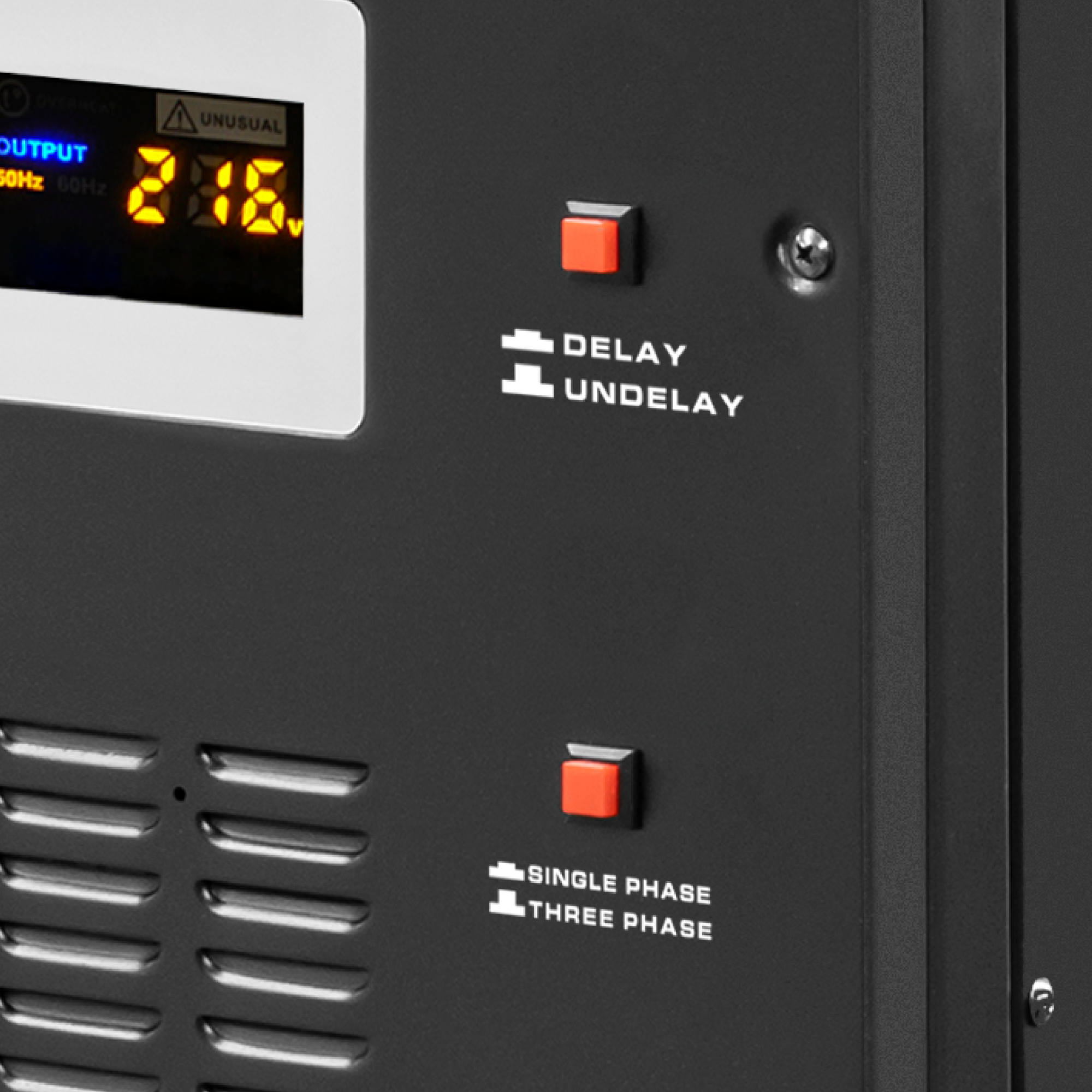 Tryb trójfazowyW trybie trójfazowym istotne jest zachowanie równowagi między fazami. Stabilizator monitoruje i kontroluje napięcie na każdej fazie, aby zapewnić zgodność między nimi - wyrówna zbyt wysokie lub zbyt niskie napięcie wejściowe i poda na wyjście napięcie po stabilizacji. Jeżeli w tym trybie któraś z faz nie zadziała poprawie lub jest nie podłączona, to w urządzenie uruchomi zabezpieczenie i nie poda napięcia na wyjście, informując o tym poprzez kontrolkę „BŁĄD FAZY”.