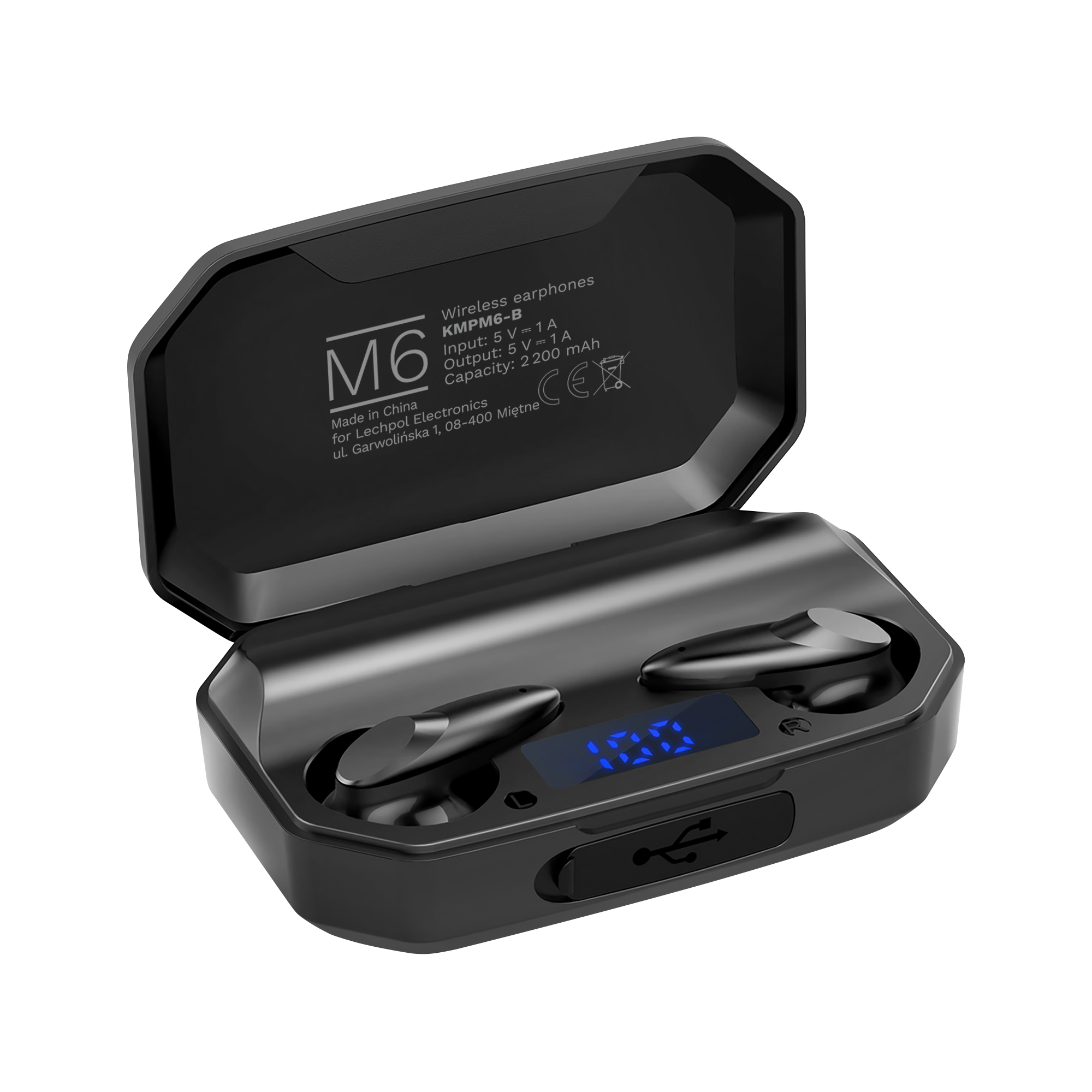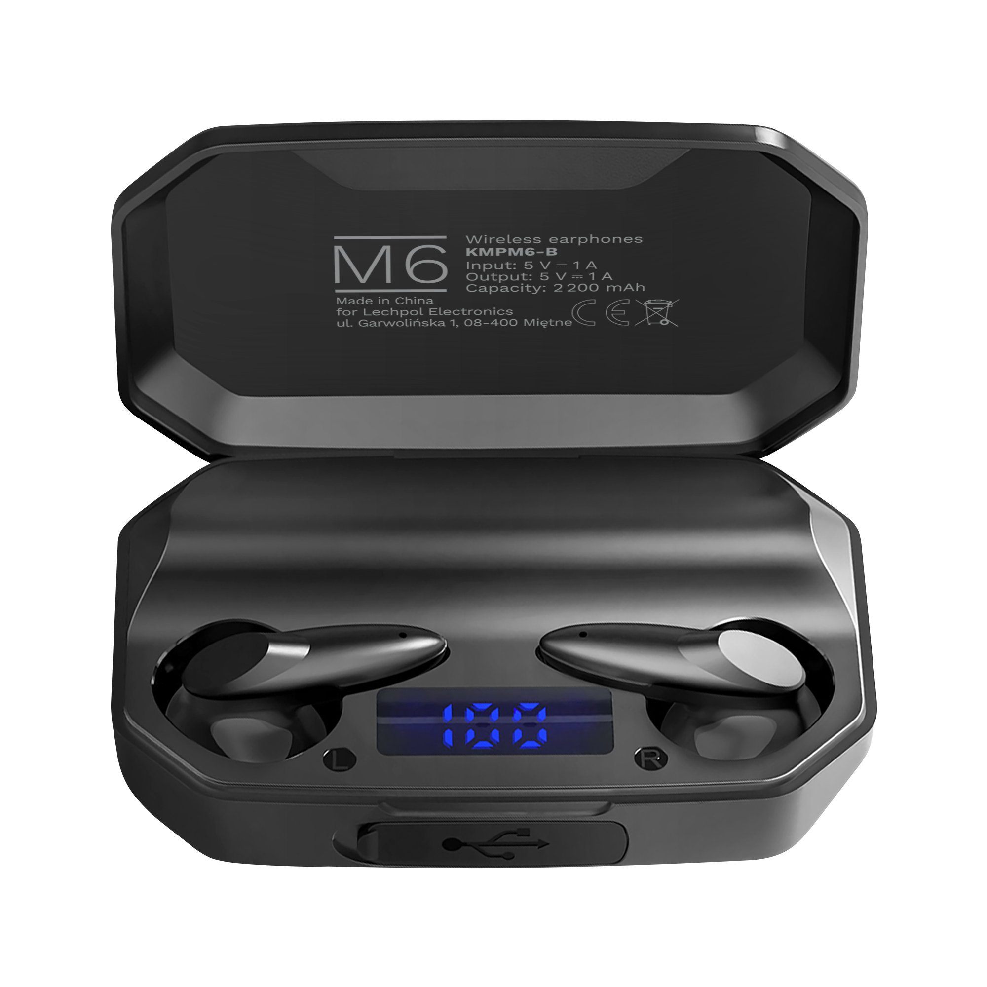 Etui z power bankiemEtui, które otrzymujesz ze słuchawkami bezprzewodowymi M6, nie tylko umożliwia ich ładowanie i bezpieczne przechowywanie. Dzięki wbudowanej baterii 2200 mAh staje się ono power bankiem, który pozwoli Ci doładować inne urządzenia.