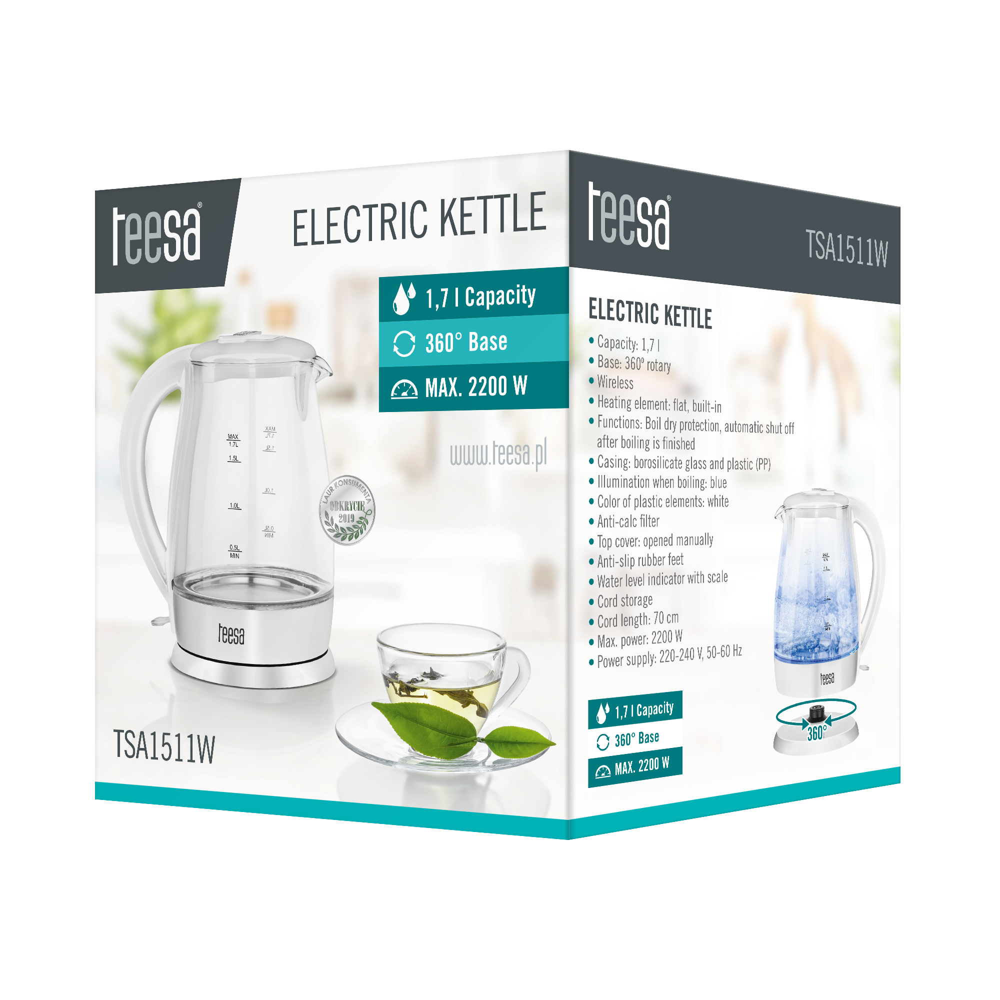 Bezprzewodowy czajnik elektryczny TSA1511WZastanawiasz się jaki czajnik elektryczny wybrać? Polecamy TSA1511, którego design przypadnie do gustu każdemu, kto ceni nowoczesność. Przeszklenie w połączeniu z niebieskim podświetleniem, które eksponowane jest w czasie gotowania się wody oraz możliwość wyboru jednej z dwóch wersji kolorystycznych (białej lub czarnej), sprawi, że szklany czajnik elektryczny Teesa będzie efektowną ozdobą w Twojej kuchni.