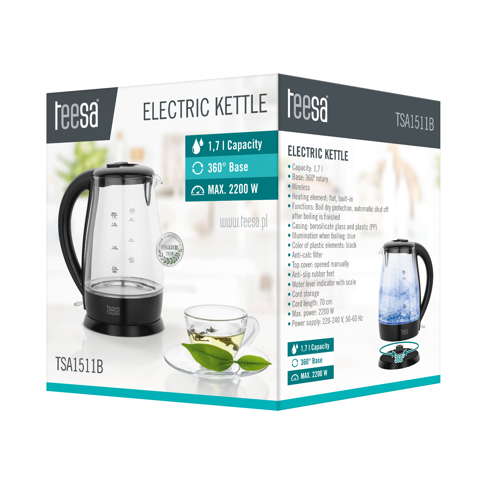 Bezprzewodowy czajnik elektryczny TSA1511BZastanawiasz się jaki czajnik elektryczny wybrać? Polecamy TSA1511, którego design przypadnie do gustu każdemu, kto ceni nowoczesność. Przeszklenie w połączeniu z niebieskim podświetleniem, które eksponowane jest w czasie gotowania się wody oraz możliwość wyboru jednej z dwóch wersji kolorystycznych (białej lub czarnej), sprawi, że szklany czajnik elektryczny Teesa będzie efektowną ozdobą w Twojej kuchni.