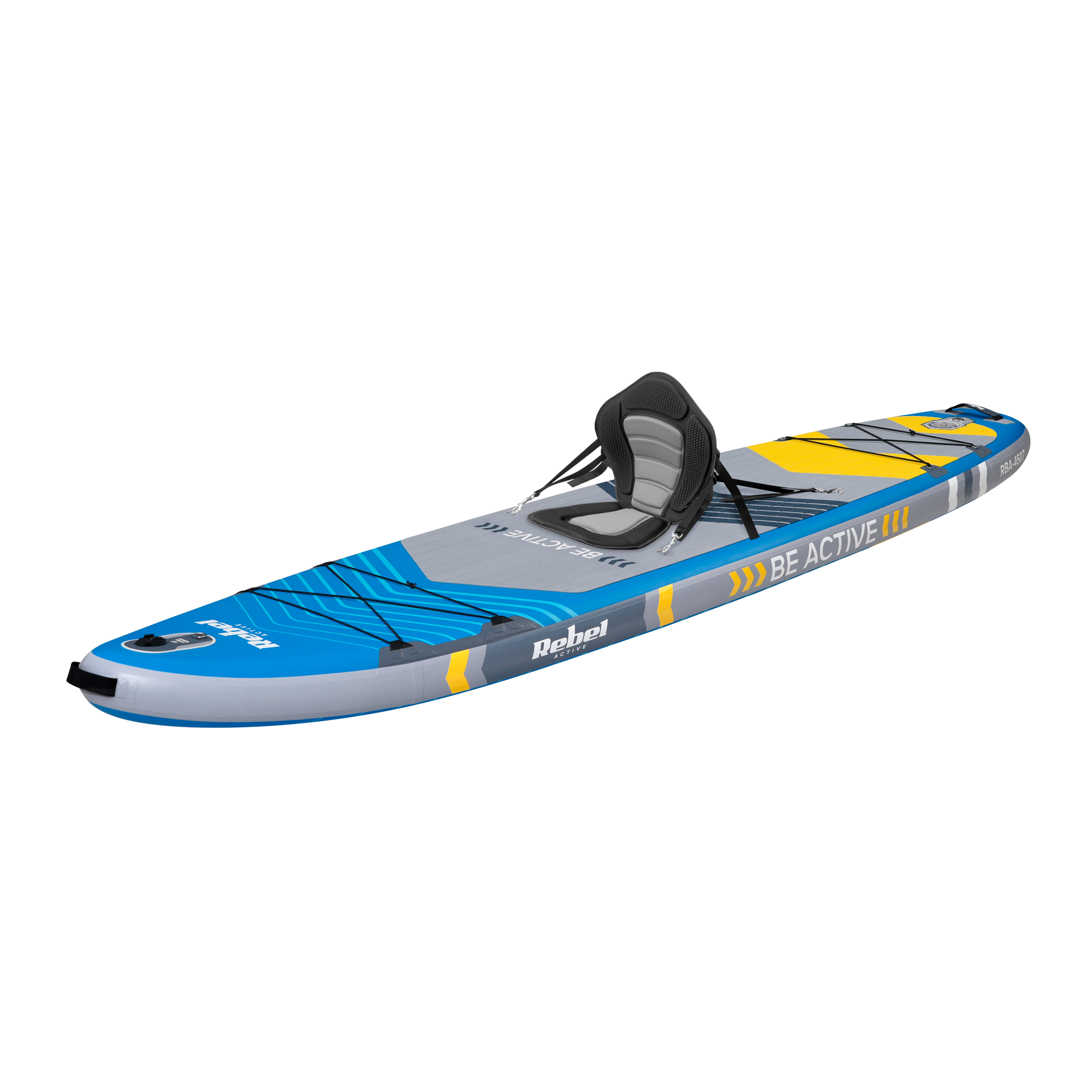 SUP z siedziskiemDla jeszcze większego komfortu i stabilności podczas pływania w zestawie z deską SUP Rebel Active znajdziesz wygodne siedzisko z oparciem, które w zależności od swoich preferencji możesz łatwo zamontować i zdemontować. To rozwiązanie pozwala na wygodny odpoczynek podczas dłuższych wycieczek na wodzie. Usiądź, zrelaksuj się i ciesz się widokami i spokojem natury.