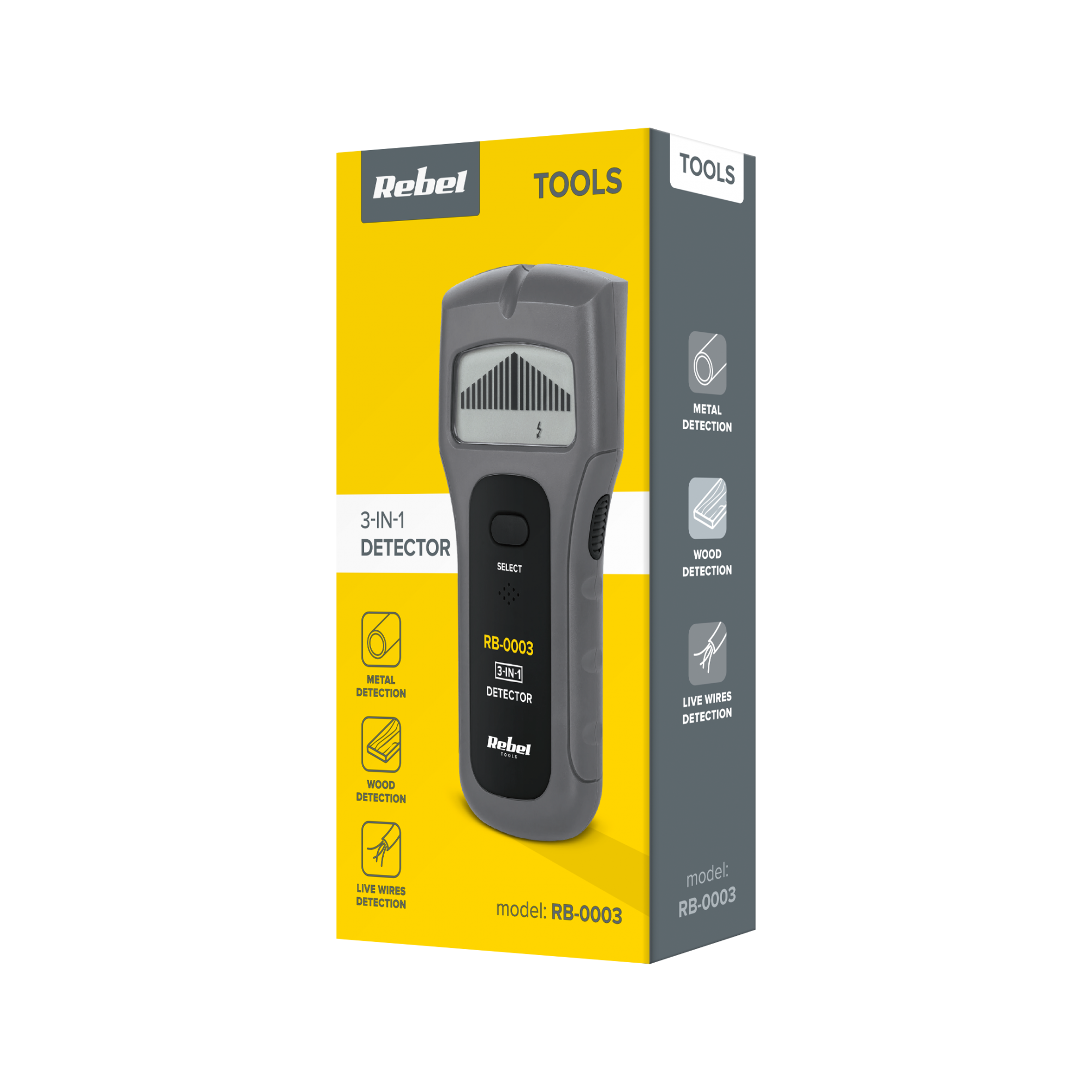 Detektor metali, napięcia i drewna REBEL RB-0003Detektor REBEL RB-0003 to niezastąpione narzędzie dla majsterkowiczów oraz profesjonalistów, umożliwiające szybkie i precyzyjne wykrywanie metalowych, drewnianych oraz elektrycznych elementów w ścianach. Dzięki wszechstronności i intuicyjnej obsłudze, ułatwia wykonywanie prac montażowych, remontowych i instalacyjnych.