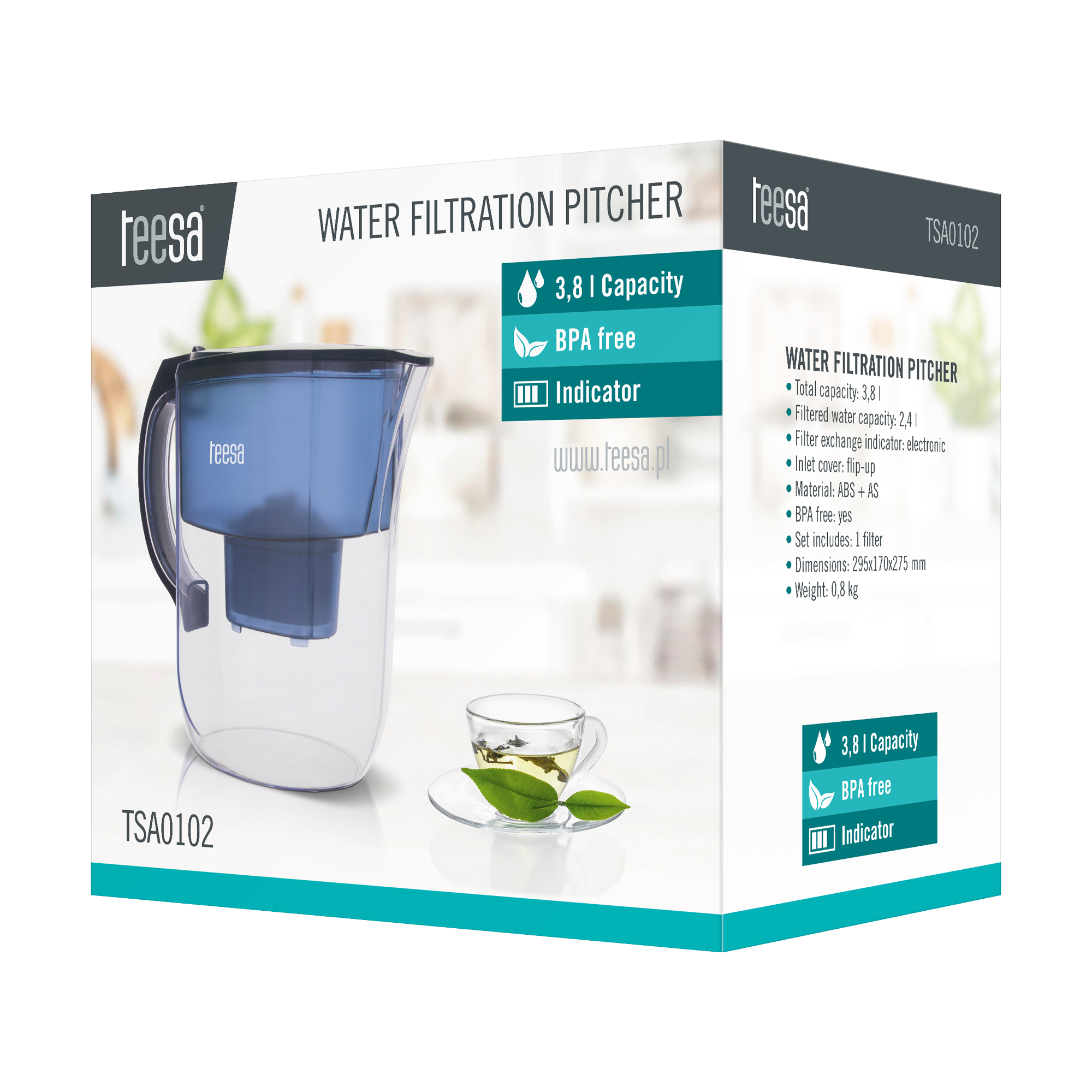 Oszczędzaj i chroń środowiskoDzbanek filtrujący Teesa to produkt, który powinien znaleźć się w Twojej kuchni. Używając go, oczyszczasz kranówkę z kamienia, chloru i innych szkodliwych substancji, dzięki czemu, możesz ją pić bez wcześniejszego przegotowania. Wykonany z wolnego od BPA tworzywa dzbanek posiada aż 2l pojemności przefiltrowanej wody. Dlatego niezależnie od tego czy przygotowujesz poranną herbatę, czy orzeźwiającą wodę z miętą, masz pewność, że wystarczy jej dla wszystkich członków Twojej rodziny.