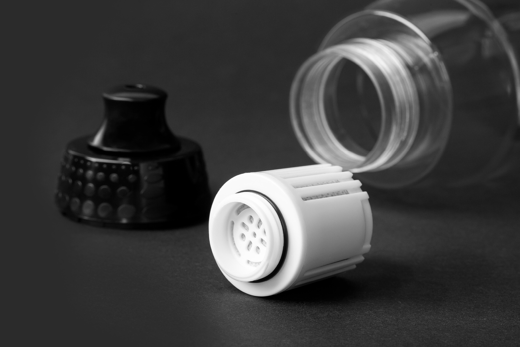 Filtr węglowyButelka posiada 3-stopniowy system filtracji. Filtr osadowy zatrzymuje sypkie materiały, m.in. kurz i osad, filtr z aktywnym węglem bardzo skutecznie adsorbuje chlor, lotne związki fenolowe oraz inne zanieczyszczenia organiczne, natomiast filtr końcowy zmniejsza wyciek drobnych cząstek z mediów filtracyjnych.