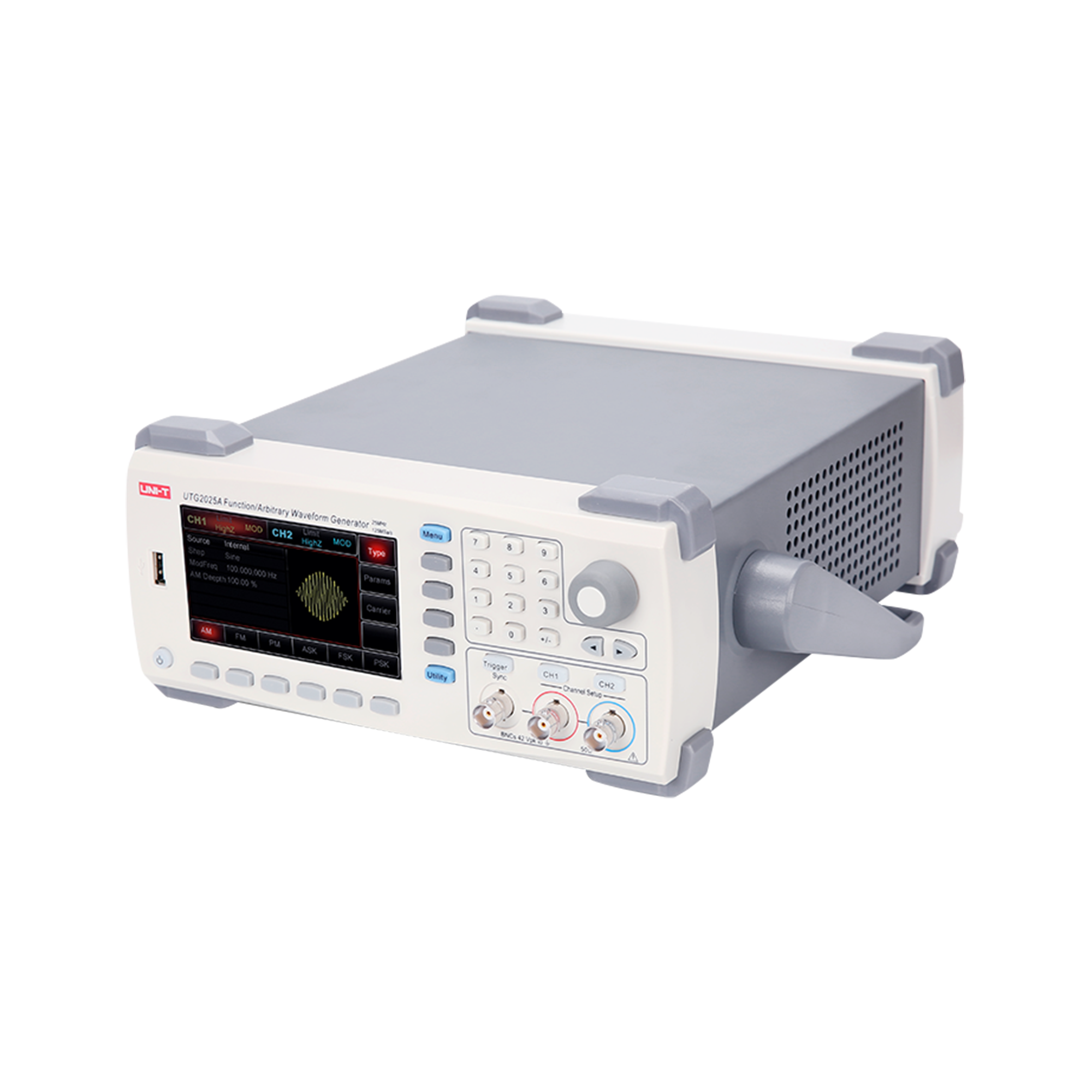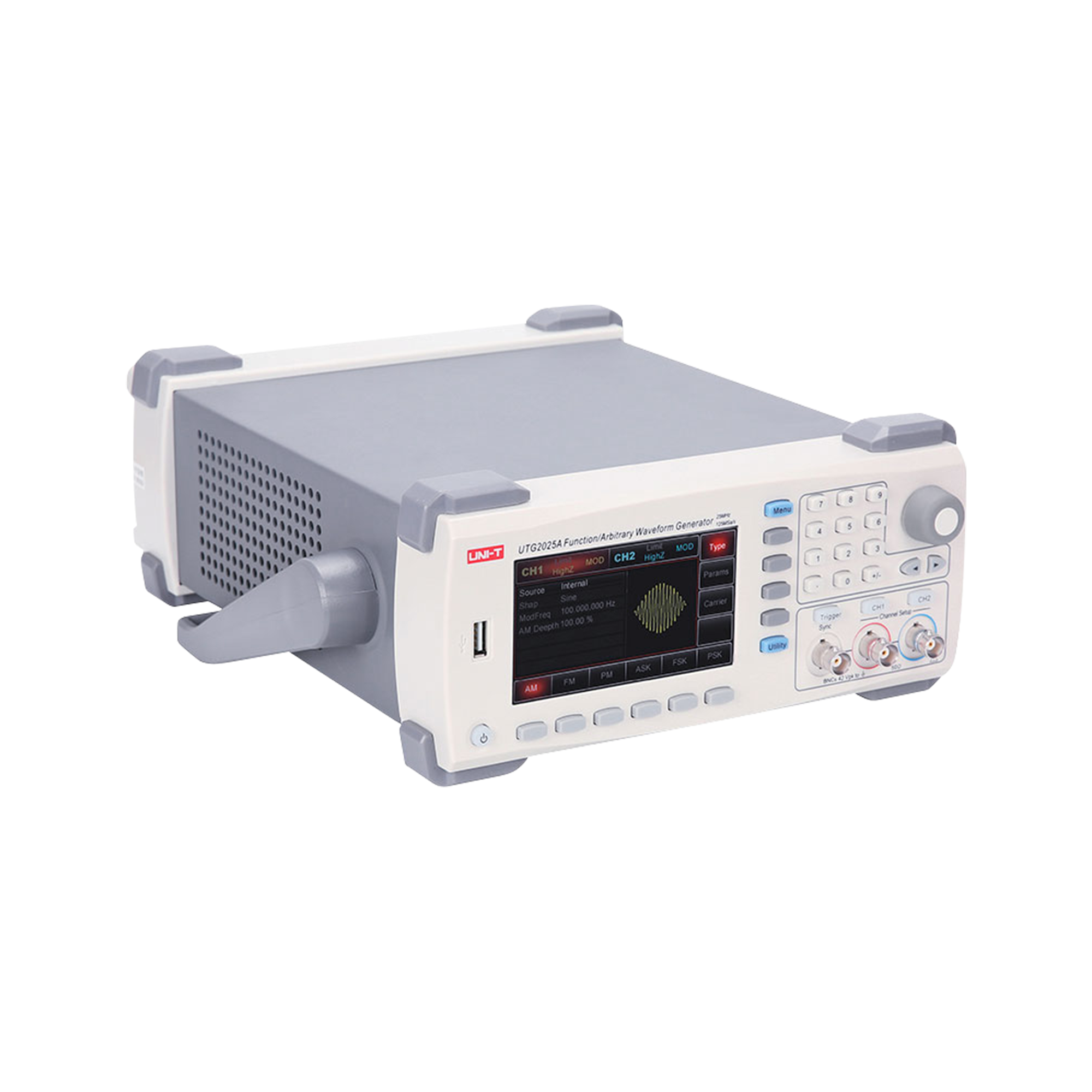 Wszechstronność Pracy i Bogaty Wybór PrzebiegówGenerator UTG2025A może generować różnorodne przebiegi, w tym sinusoidalne, kwadratowe, rampowe, impulsowe, szumowe, DC oraz przebiegi arbitralne. Urządzenie oferuje różne tryby pracy, takie jak ciągły, modulowany, przemiatanie oraz burst, co czyni go niezwykle elastycznym narzędziem. Obsługuje także zaawansowane rodzaje modulacji, takie jak AM, FM, PM, ASK, FSK, PSK oraz PWM, co pozwala na szerokie zastosowanie w testowaniu i symulacjach sygnałów.