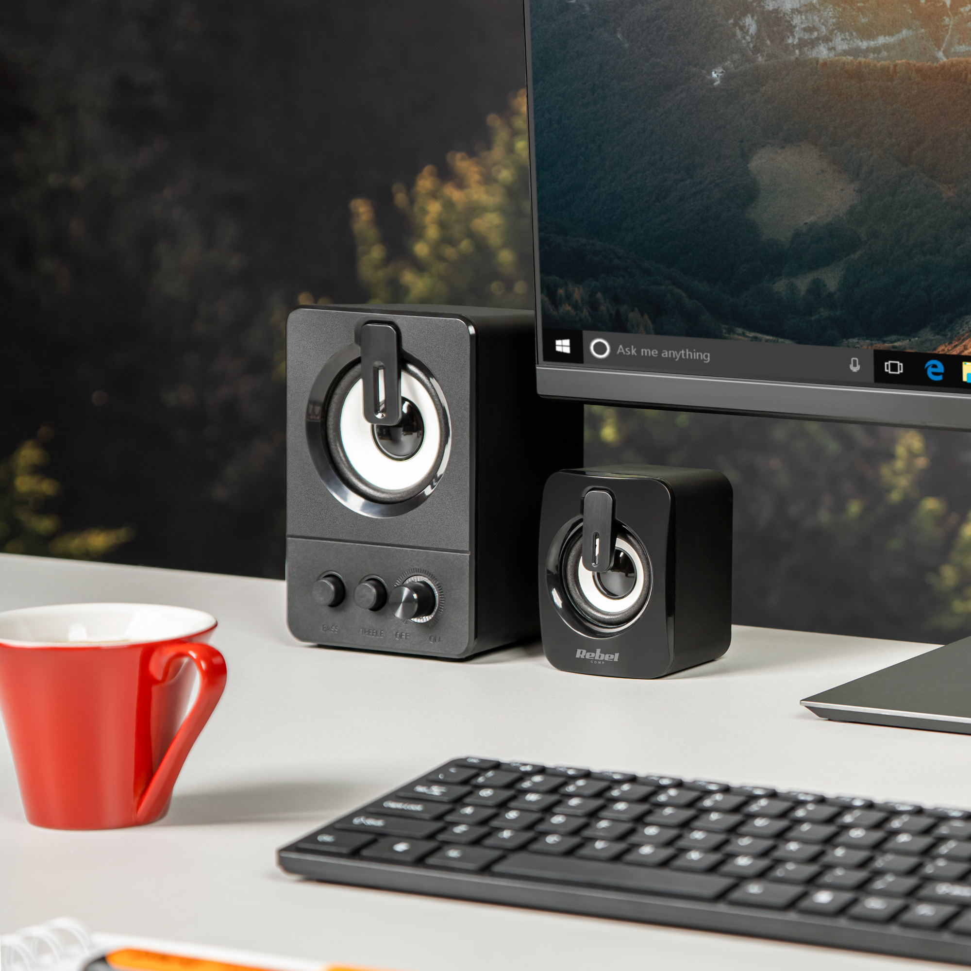 Słuchaj jak chceszTo, co z pewnością zasługuje na uwagę to regulacja tonów niskich i wysokich, która umożliwi Ci dostosowanie brzmienia do Twoich upodobań. Co ważne, zarówno pokrętła regulacji tonów, jak też pokrętło regulacji głośności znajdują się na przedniej obudowie subwoofera, dzięki czemu są one łatwo dostępne i zapewniają komfortowe korzystanie z komputerowych głośników Rebel.