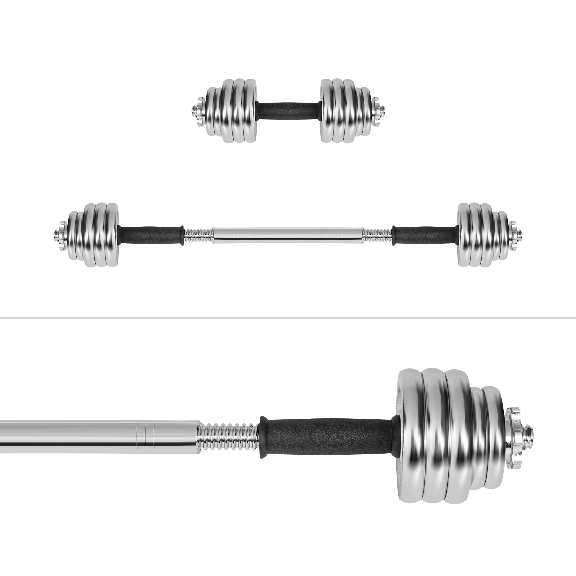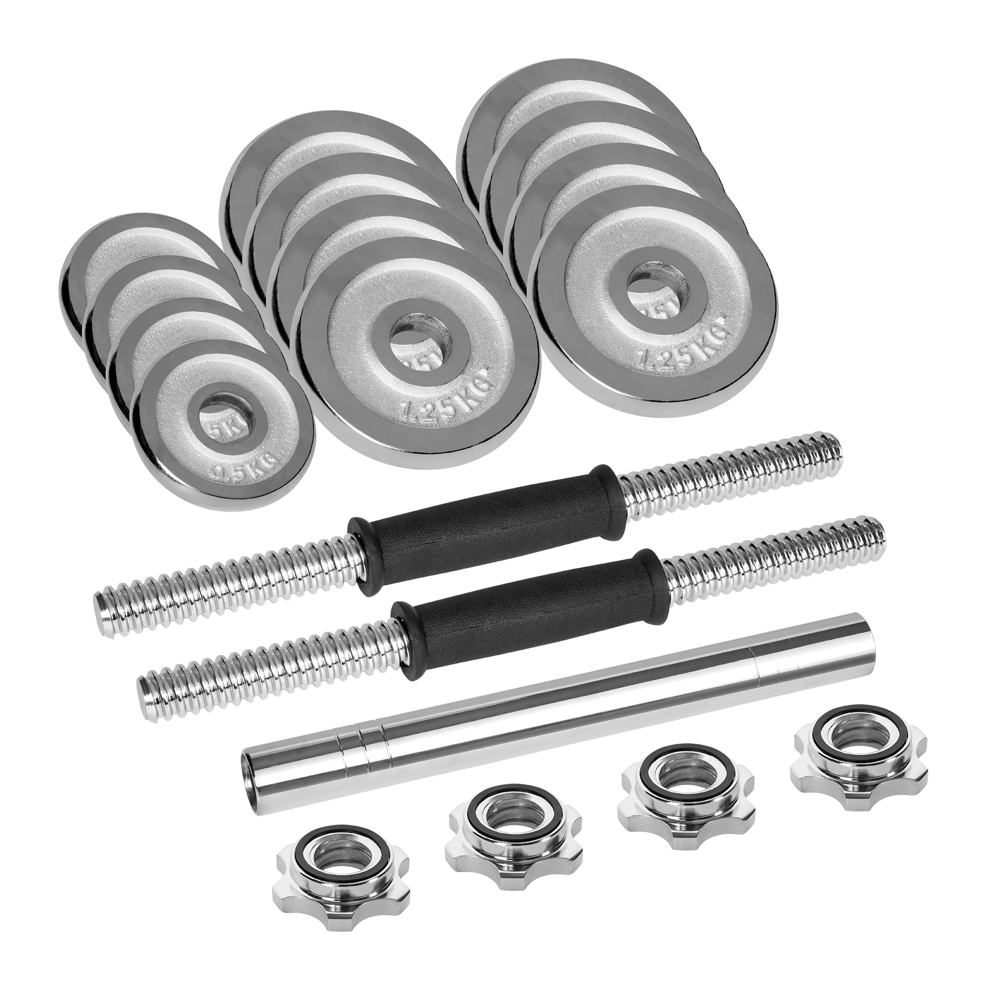 Jakość, którą widaćZestaw wykonany z wysokiej jakości żeliwa, pokrytego trwałą powłoką chromowaną, która zabezpiecza przed korozją, zarysowaniami i uszkodzeniami mechanicznymi. Chrom nadaje hantlom elegancki wygląd i zwiększa ich żywotność, nawet przy intensywnym użytkowaniu.