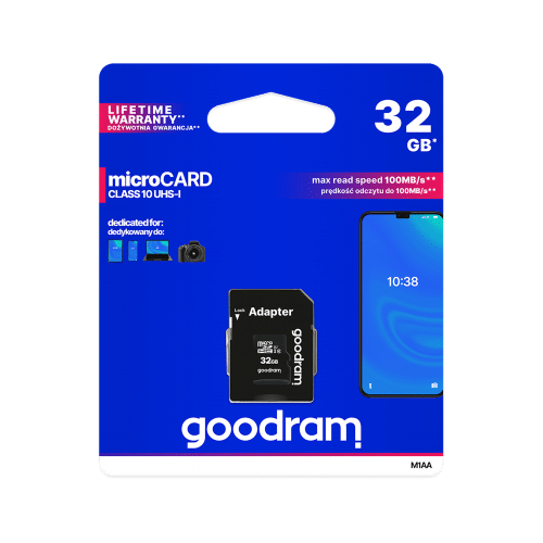 Szybki interfejs UHS-I W karcie zastosowano szybki interfejs UHS-I, który znacząco wpływa na zwiększenie parametrów pracy do 100 MB/s (odczyt) i od 10 MB/s (zapis). Ma to bezpośredni wpływ na jakość i niezawodność wykonywanych operacji. Szerokie zastosowanie Dzięki klasie szybkości UHS-I karta GOODRAM pozwala na uchwycenie idealnego ujęcia na każdym urządzeniu – nie ważne czy w kamerze sportowej, smartfonie, czy innym urządzeniu wyposażonym w slot microSD. Uchwyć najlepszy moment Dzięki wykorzystaniu adaptera (w zestawie M1AA) można zwiększyć funkcjonalność karty microCARD. Dzięki adapterowi karta microCARD może być używana w aparatach, PC i laptopach z gniazdem kart SD. Wieczysta gwarancja i wytrzymałość Cechy karty pamięci M1A0/M1AA to: odporność na wstrząsy, promienie RTG, promieniowanie magnetyczne, czy wodoodporność. Dzięki najwyższej jakości, staranie wyselekcjonowanym komponentom sprawdzą się idealnie w ekstremalnych warunkach.Wszystkie karty pamięci serii GOODRAM zostały objęte dożywotnią gwarancją na dowód staranności jakie polski producent wkłada w ich produkcję.
