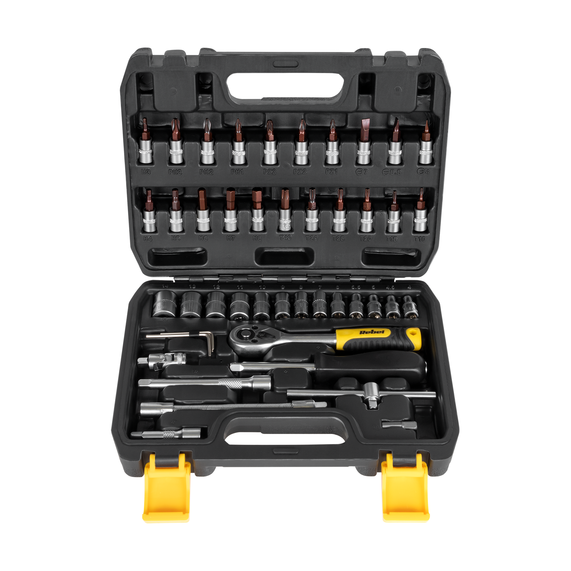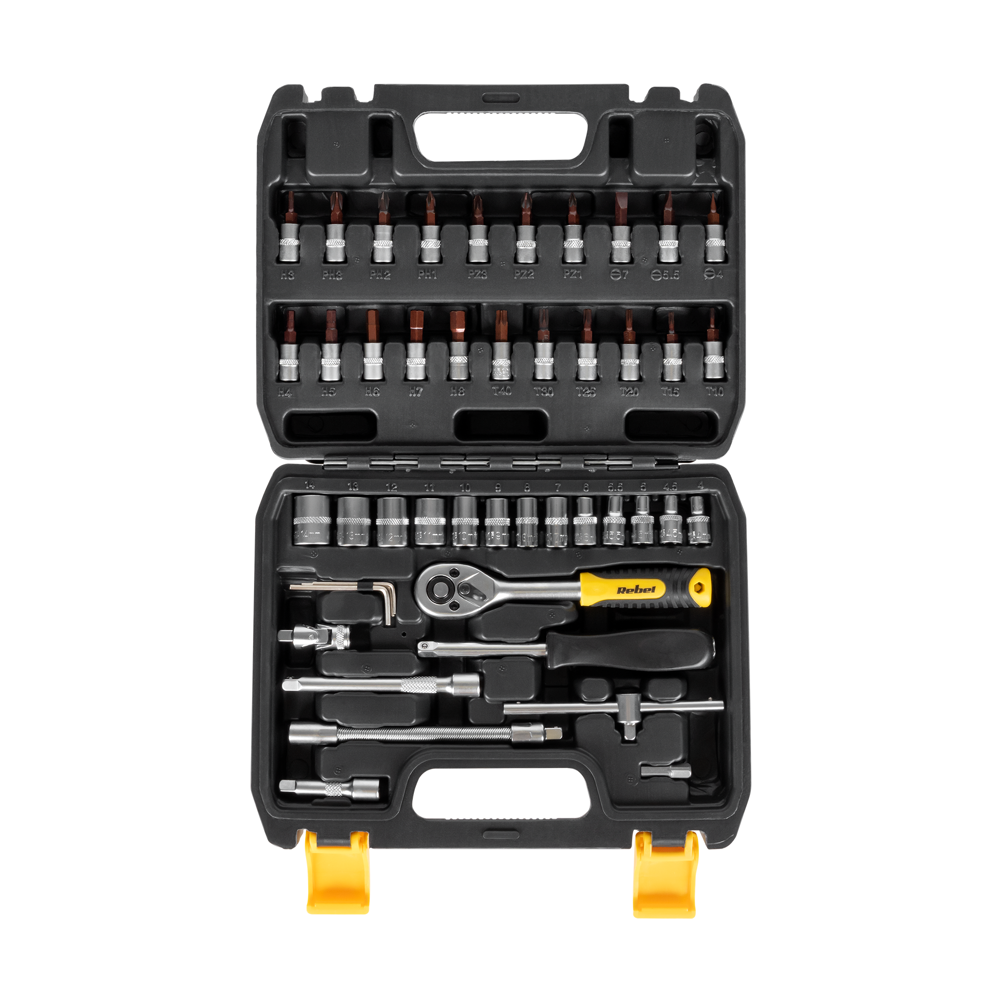 Gumowana rękojeść grzechotki, sprawia że narzędzie jest wyjątkowo wygodne w użyciu, nawet podczas długotrwałej pracy. Zestaw zawiera szeroką gamę nasadek, kluczy oraz przedłużek, co zapewnia wszechstronność w różnych zastosowaniach.
