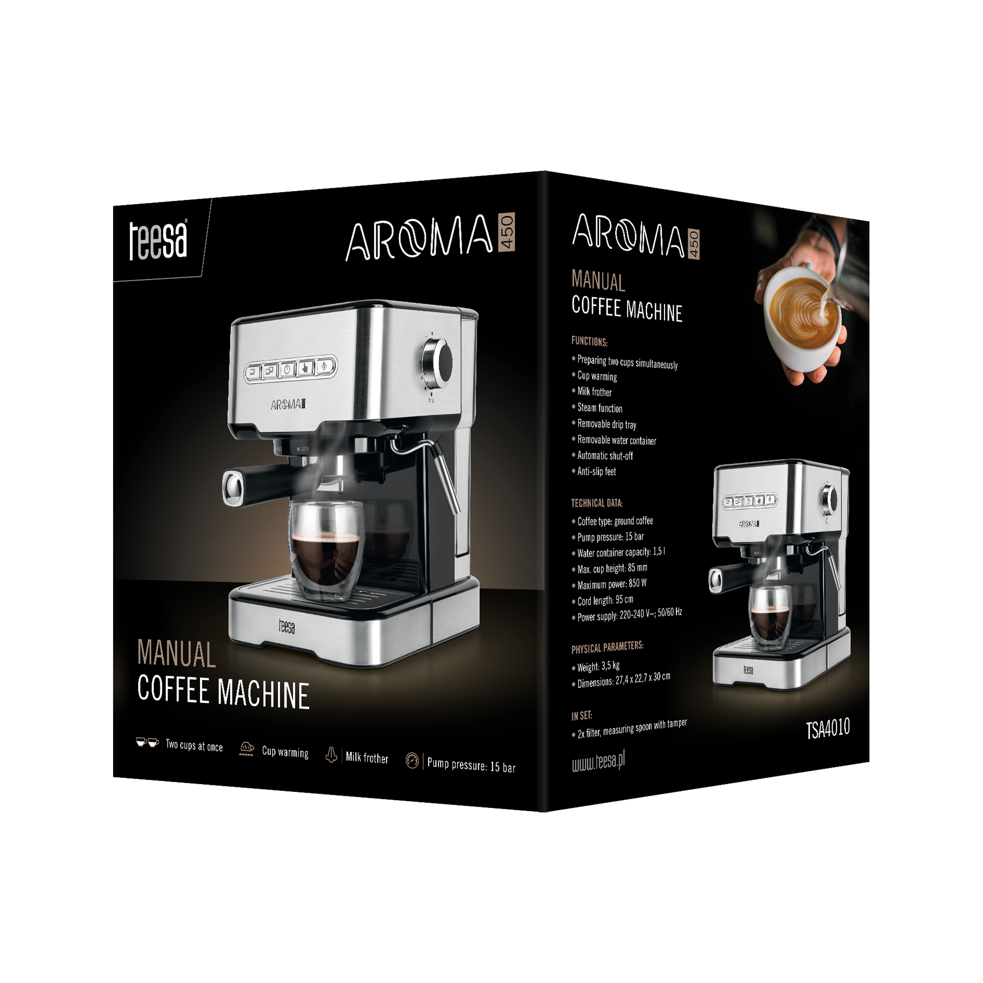 Ekspres kolbowy TEESA AROMA 450Zastanawiasz się jaki ekspres kolbowy sprawdzi się w Twojej kuchni? Teesa Aroma 400 wypełni Twój dom aromatem świeżo parzonej kawy. Urządzenie idealnie wkomponuje się we wnętrze kuchni, a dzięki kompaktowym wymiarom, nie zajmie dużo miejsca na blacie.