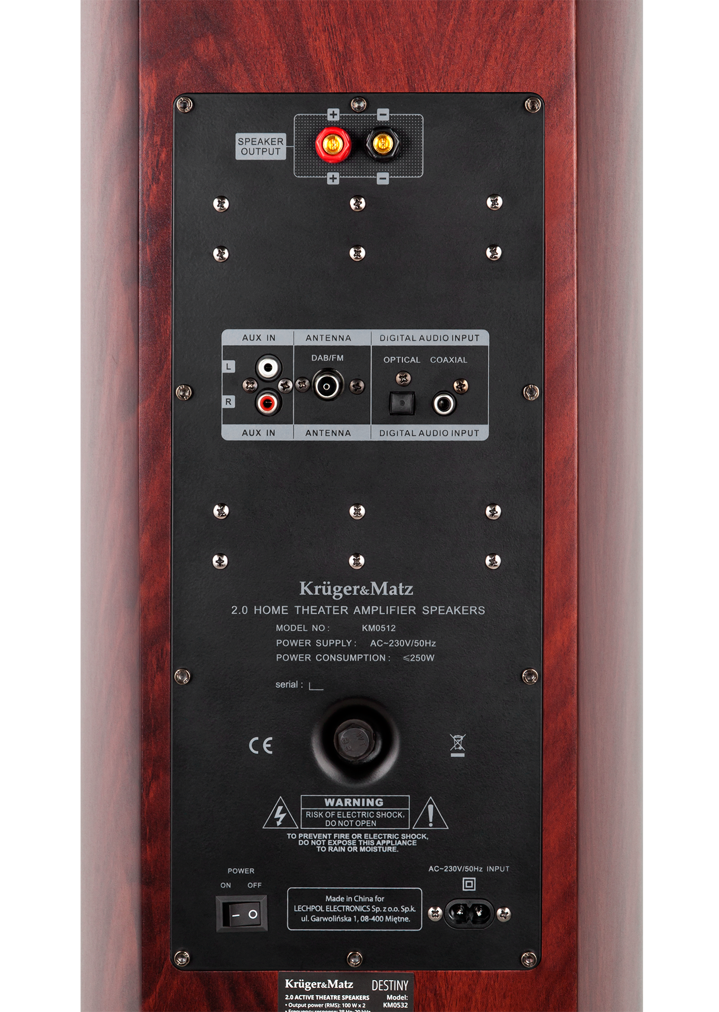 Aktywne kolumny głośnikowe Kruger&Matz Destiny 2.0Jeśli szukasz mieszanki doskonałego brzmienia, stylowego wyglądu i praktycznych rozwiązań, zestaw aktywnych kolumn głośnikowych Destiny 2.0 jest właśnie dla Ciebie. Zachwyca on nie tylko dźwiękiem, ale też wykonaniem. Obudowa fornirowana drewnem w połączeniu z czarnymi maskownicami nadaje kolumnom klasy oraz sprawia, że będą prezentować się doskonale w każdym wnętrzu.